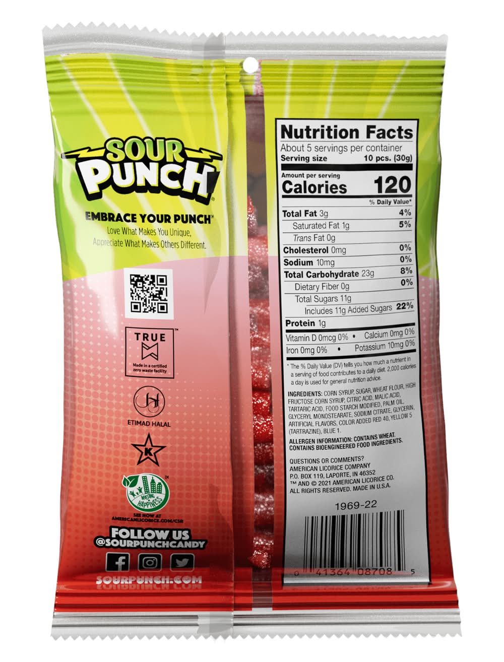 offers a mix of Each pack contains approximately 5 servings, with a serving size providing These candies are produced with genetic engineering. • Brand: Sour punch • Flavor: Assorted