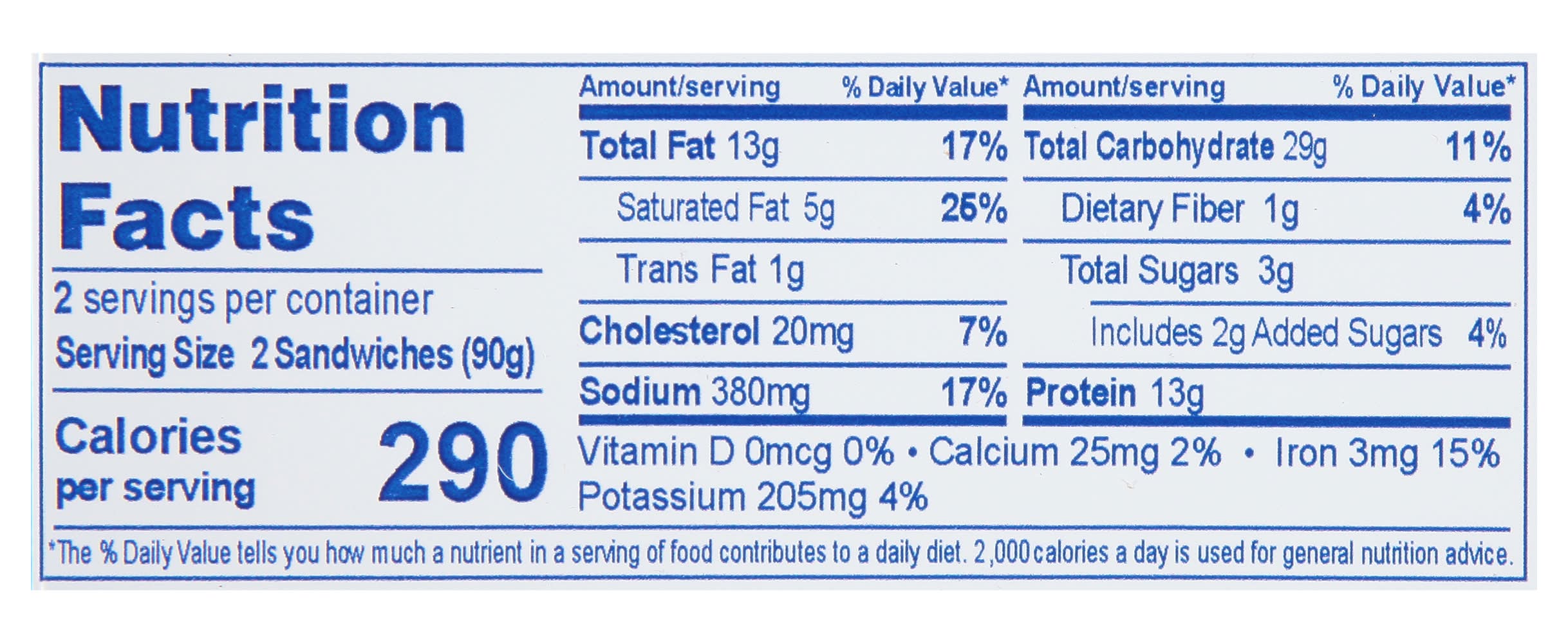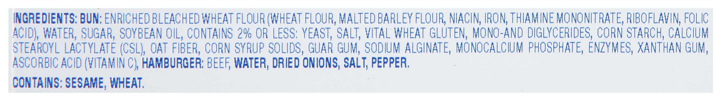 Ingredients: Bun: Enriched Bleached Wheat Flour (Wheat Flour, Malted Barley Flour, Niacin, Iron, Thiamine Mononitrate, Riboflavin, Folic Acid), Water, Sugar, Soybean Oil, Contains 2% or Less: Yeast, Salt, Vital Wheat Gluten, Mono- and Diglycerides, Corn Starch, Calcium Stearoyl Lactylate (CSL), Oat Fiber, Corn Syrup Solids, Guar Gum, Sodium Alginate, Monocalcium Phosphate, Enzymes, Xanthan Gum, Ascorbic Acid (Vitamin C), Hamburger: Beef, Water, Dried Onions, Salt, Pepper Contains: Corn, Barley, Sesame, Wheat, Oat, Soybeans