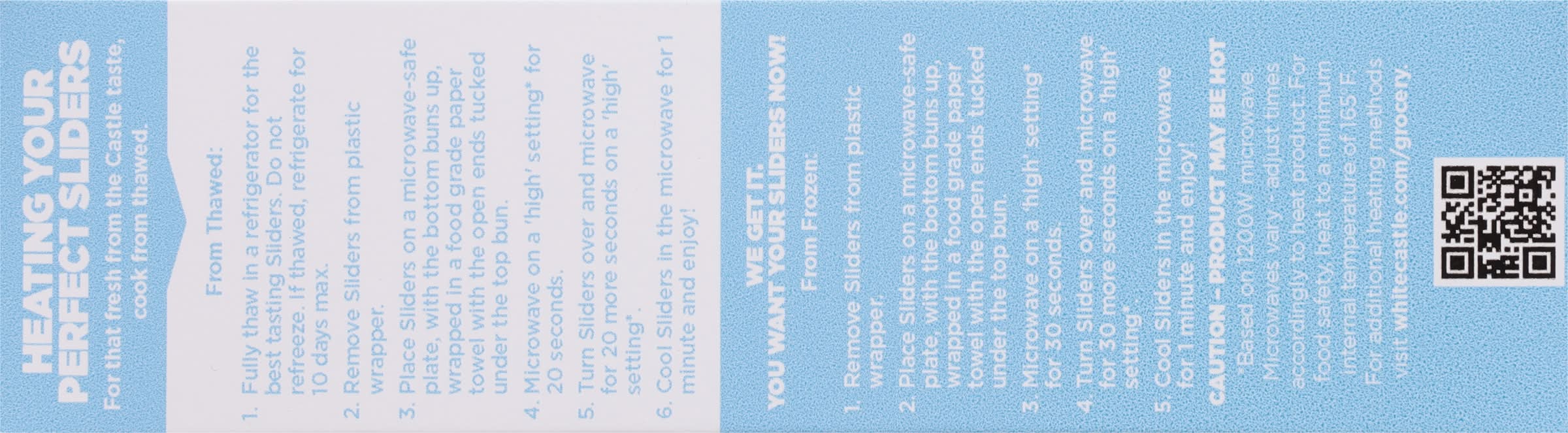Directions for use: Directions: Heating Your Perfect Sliders: For that fresh from the Castle taste, cook from thawed. From Thawed: (1) Fully thaw in a refrigerator for the best tasting sliders. Do not refreeze. If thawed, refrigerate for 10 days max. (2) Remove sliders from plastic wrapper. (3) Place sliders on a microwave-safe plate, with the bottom buns up, wrapped in a food grade paper towel with the open ends tucked under the top bun. (4) Microwave on a high setting (Based on 1200W microwave. Microwaves vary - adjust times accordingly to heat product. For food safety, heat to a minimum internal temperature of 165 degrees F. for 20 seconds. (5) Turn sliders over and microwave for 20 more seconds on a high setting (Based on 1200W microwave. Microwaves vary - adjust times accordingly to heat product. For food safety, heat to a minimum internal temperature of 165 degrees F. (6) Cool sliders in the microwave for 1 minute and enjoy! We get it. You want your sliders now! From Frozen: (1) Remove sliders from plastic wrapper. (2) Place sliders on a microwave-safe plate, with the bottom buns up, wrapped in a food grade paper towel with the open ends tucked under the top bun. (3) Microwave on a high setting (Based on 1200W microwave. Microwaves vary - adjust times accordingly to heat product. For food safety, heat to a minimum internal temperature of 165 degrees F. for 30 seconds. (4) Turn sliders over and microwave for 30 more seconds on a high setting (Based on 1200W microwave. Microwaves vary - adjust times accordingly to heat product. For food safety, heat to a minimum internal temperature of 165 degrees F. (5) Cool sliders in the microwave for 1 minute and enjoy Caution - Product may be hot. Pull tab to unleash the crave! Storage recommendation: Keep frozen.
