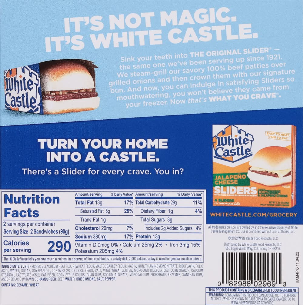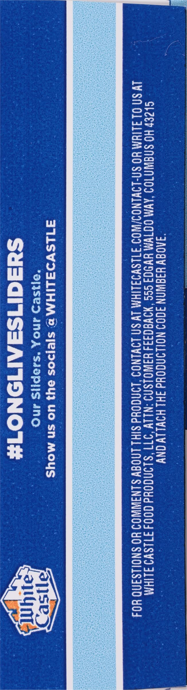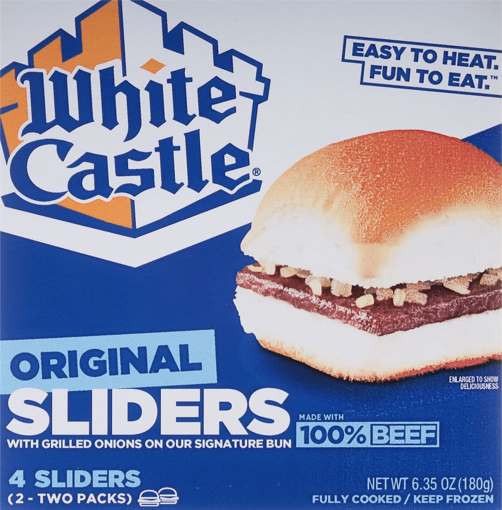 4 sliders (2 - two packs). Sliders with grilled onions on our signature bun. This product contains a bioengineered food ingredient. Easy to heat. Fun to eat. Fully cooked. It's not magic. It's White Castle. Sink your teeth into The Original Slider - the same one we've been serving up since 1921. We steam-grill our savory 100% beef patties over grilled onions and then crown them with our signature bun. And now, you can indulge in satisfying Sliders so mouthwatering, you won't believe they came from your freezer. Now that's What You Crave. Turn your home into a Castle. Brand: White castle