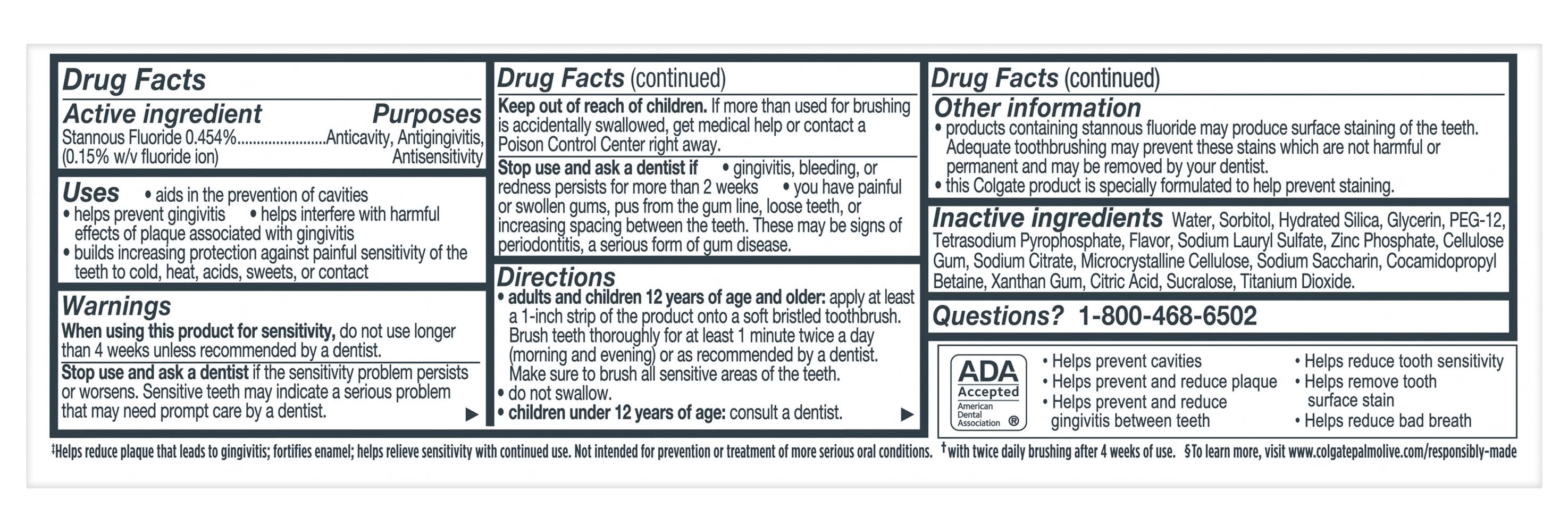 Ingredients: Active ingredient(s), : Stannous Fluoride 0.454% (0.15% w/v fluoride ion), . Inactive ingredients: Water, Sorbitol, Hydrated Silica, Glycerin, PEG-12, Tetrasodium Pyrophosphate, Flavor, Sodium Lauryl Sulfate, Zinc Phosphate, Cellulose Gum, Sodium Citrate, Microcrystalline Cellulose, Sodium Saccharin, Cocamidopropyl Betaine, Xanthan Gum, Citric Acid, Sucralose, Titanium Dioxide Additives: Inactive Ingredients: Water, Sorbitol, Hydrated Silica, Glycerin, PEG-12, Tetrasodium Pyrophosphate, Sodium Lauryl Sulfate, Flavor, Microcrystalline Cellulose, Sodium Citrate, Zinc Phosphate, Cellulose Gum, Sodium Saccharin, Cocamidopropyl Betaine, Propylene Glycol, Xanthan Gum, Citric Acid, Sucralose, Titanium Dioxide.