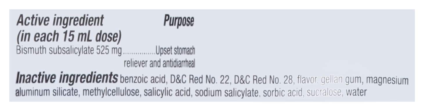 Ingredients: Active Ingredients: In Each 30 ml: Bismuth Subsalicylate (1050 mg). Purposes: Upset Stomach Reliever and Antidiarrheal. Inactive Ingredients: Benzoic Acid, D&C Red No. 22, D&C Red No. 28, Flavor, Magnesium Aluminum Silicate, Methylcellulose, Saccharin Sodium, Salicylic Acid, Sodium Salicylate, Sorbic Acid, Water Additives: Benzoic Acid, D&C Red No. 22, Flavor, Magnesium Aluminum Silicate, Methylcellulose, Saccharin Sodium, Salicylic Acid, Sodium Salicylate, Sorbic Acid, Water