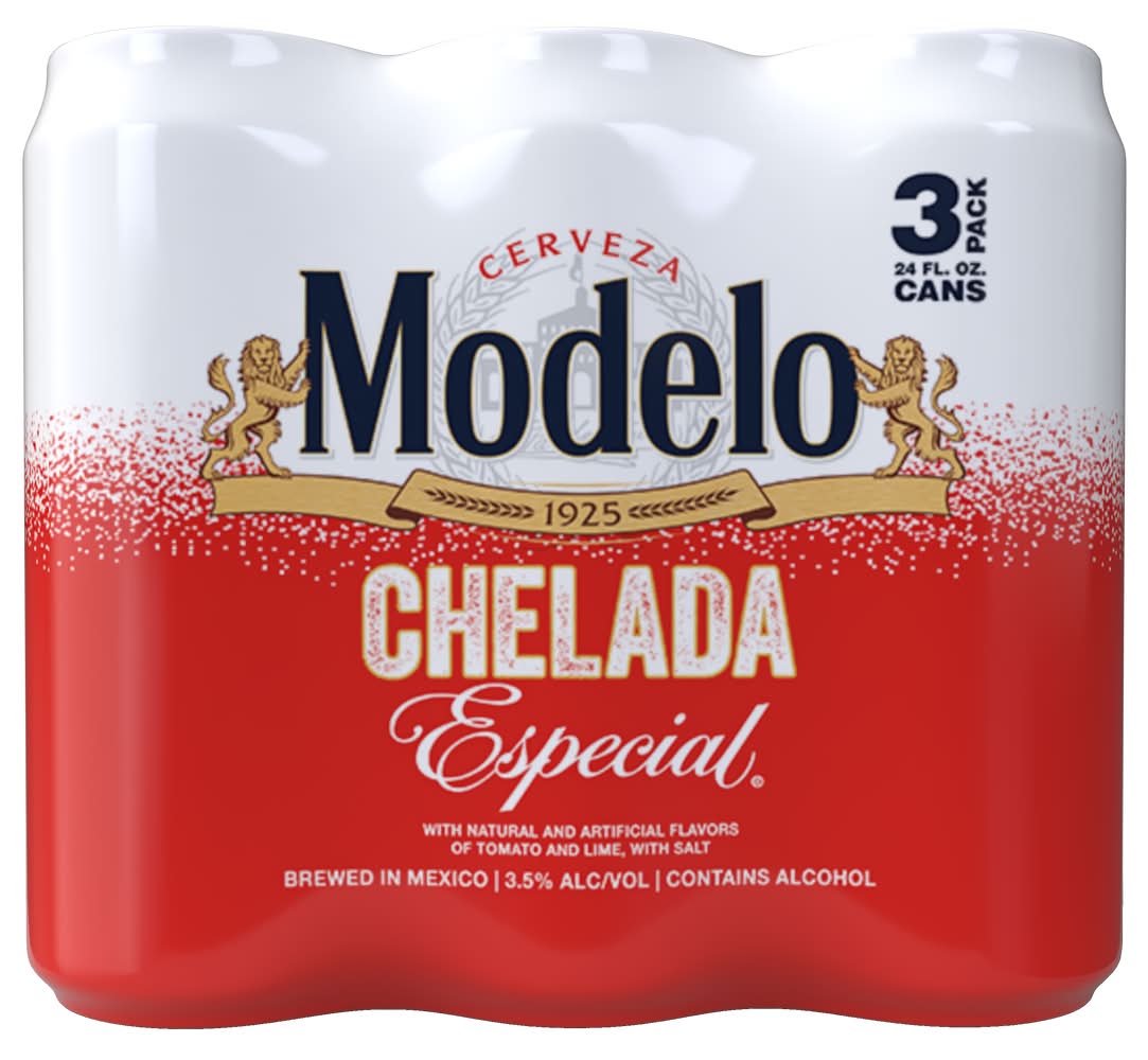 Flavored beer blends tomato, salt, and lime with authentic mexican beer for delicious, well balanced taste in a classic michelada style beer that embodies mexico's vibrancy. • Brand: Modelo • Flavor: Assorted • Pack size: 3 • Alcohol by volume: 3.5% • Suggested glassware: pint glass, snifter/goblet/chalice