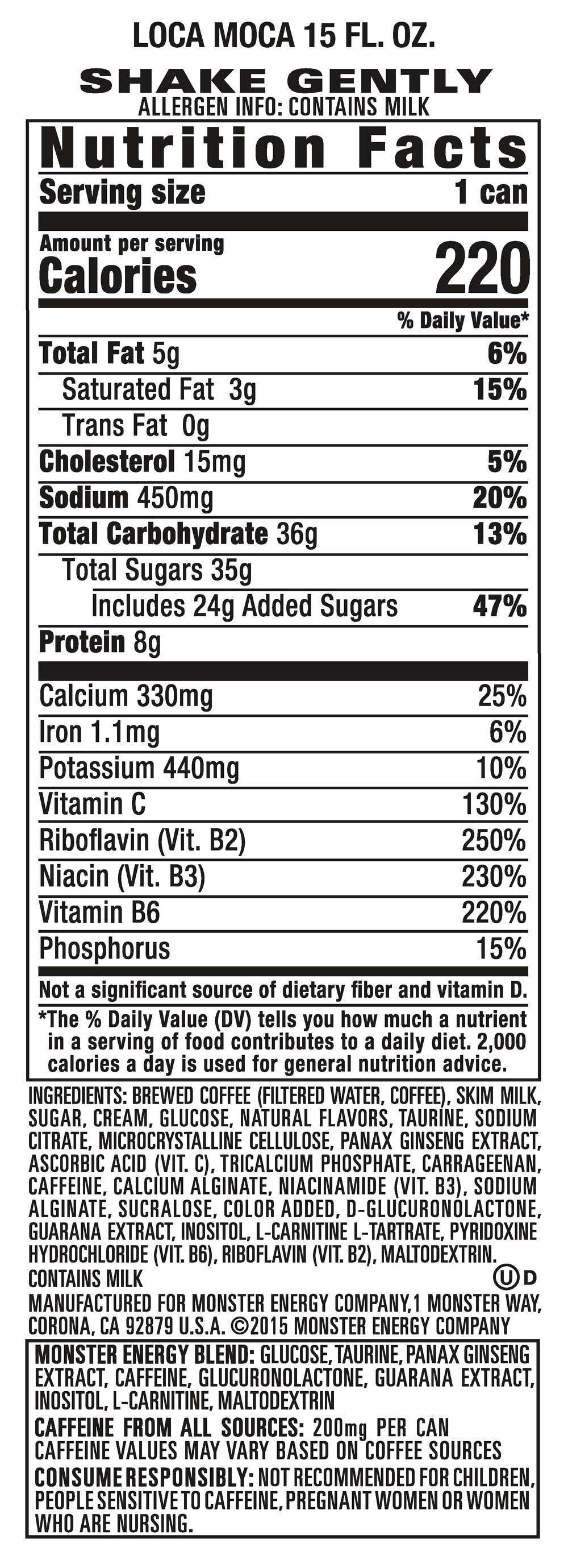 Premium coffee and cream brewed up with killer flavor, supercharge4d with Monster energy blend. • Brand: Monster energy • Flavor: Loca moca