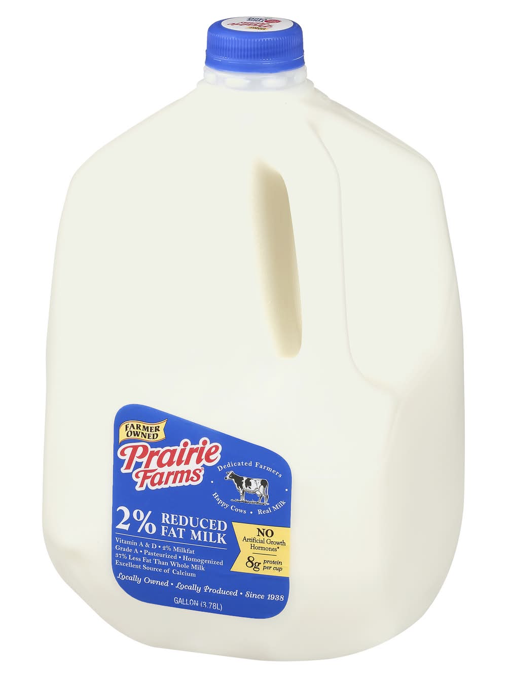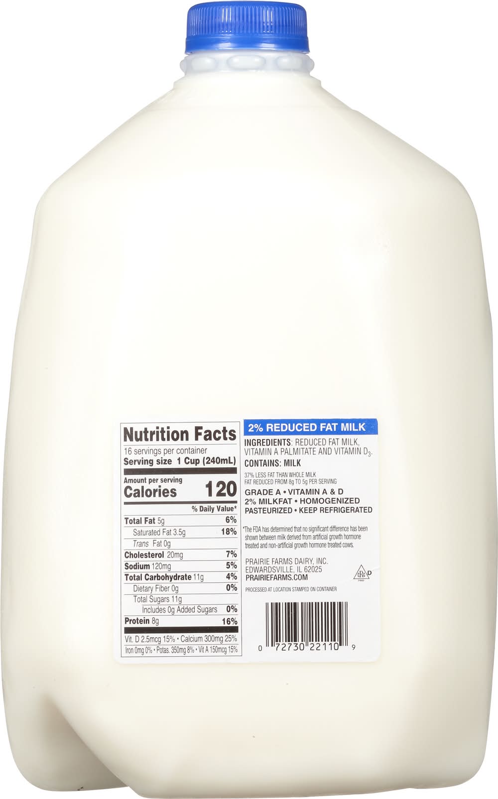 37% less fat than whole milk. Excellent source of calcium. No artificial growth hormones (The FDA has determined that no significant difference has been shown between milk derived from artificial growth hormone treated and non-artificial growth hormone treated cows). Fat reduced from 8 g to 5 g per serving. Farmer owned. Dedicated farmers. Happy cows. Real milk. Pasteurized. Homogenized. Locally owned. Locally produced. Since 1938. Processed at location stamped on container. Our caps. • Brand: Prairie farms • kosher • Prairie Farms Dairy, Inc., Edwardsville,IL,62025 • Packaging: Reusable