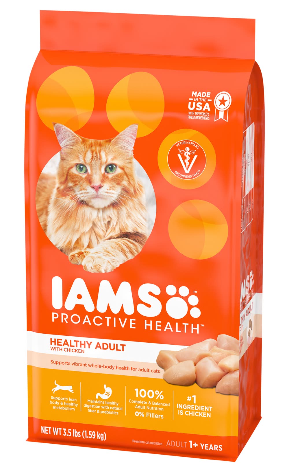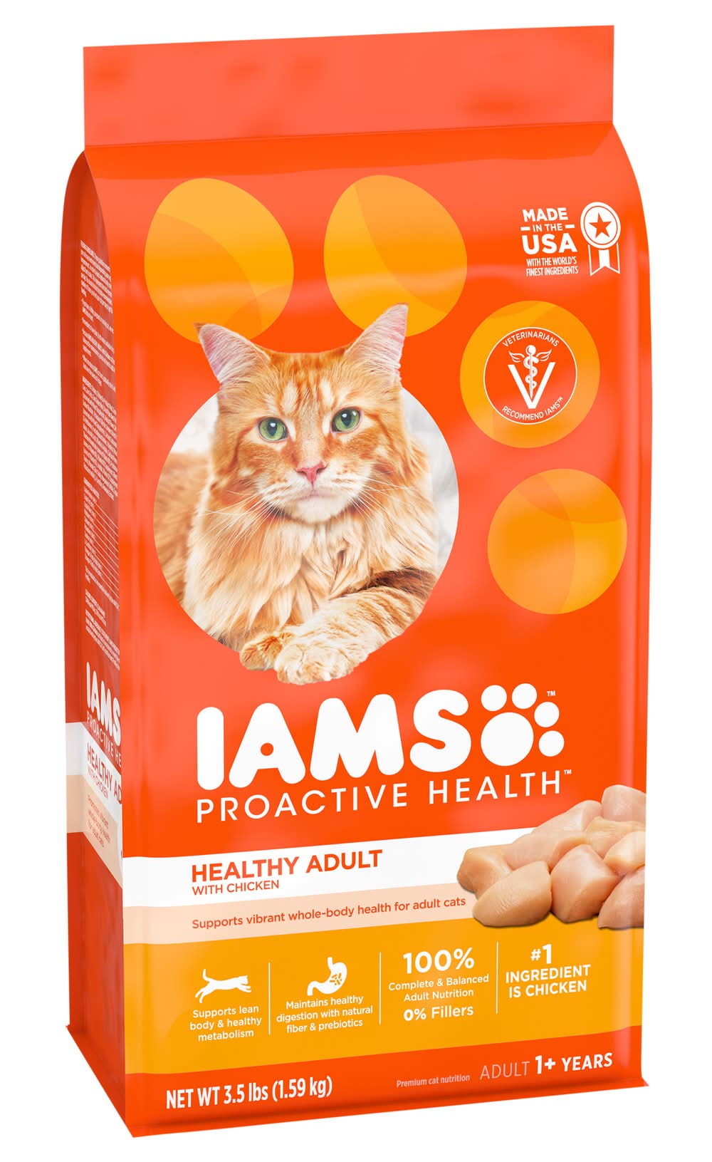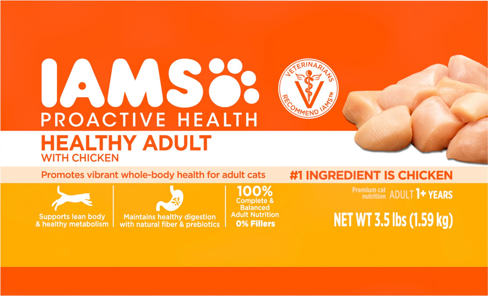 Veterinarians recommend IAMS. Supports vibrant whole-body health for adult cats. Supports lean body & healthy metabolism. Maintains healthy digestion with natural fiber & prebiotics. 100% Complete & balanced adult nutrition. 0% Fillers. Supports overall health with delicious chicken your cat loves. Key benefits in this recipe: Strong muscles: Real chicken as the 1st ingredient helps maintain strong muscles. Healthy teeth: Crunchy kibble helps reduce plaque build-up. Healthy heart: Essential nutrients, including calcium & potassium, help nourish a healthy heart. Healthy digestion: Unique fiber blend with prebiotics & beet pulp support your cat's ability to absorb nutrients. Healthy skin & coat: Optimal Omega 6:3 fatty acid ratio for a soft & shiny coat. Pet food only. Promotes vibrant whole-body health for adult cats. IAMS Cat Foods offer a 100% guarantee. If you are not satisfied with this product, simply save the unused portion, together with the proof of purchase, and call us. We will gladly replace the product or refund your money. • Brand: Iams • Size: Adult • Mars Petcare US, PO Box 683006, Franklin.