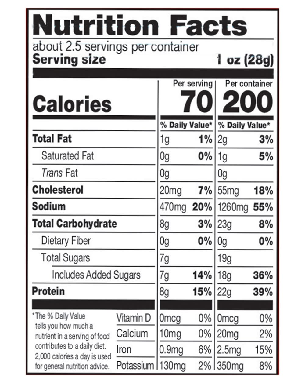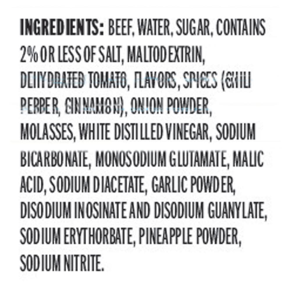 Ingredients: Beef, Water, Sugar, Contains 2% or Less of Salt, Maltodextrin, Dehydrated Tomato, Flavors, Spices (Chili Pepper, Cinnamon), Onion Powder, Molasses, White Distilled Vinegar, Sodium Bicarbonate, Monosodium Glutamate, Malic Acid, Sodium Diacetate, Garlic Powder, Disodium Inosinate and Disodium Guanylate, Sodium Erythorbate, Pineapple Powder, Sodium Nitrite