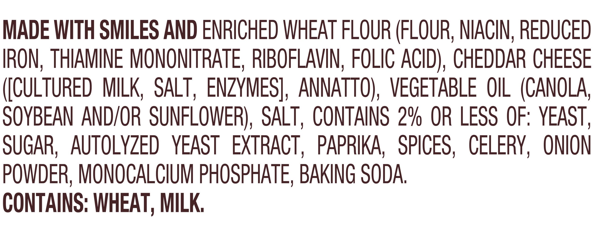 Ingredients: MADE WITH SMILES AND ENRICHED WHEAT FLOUR (FLOUR, NIACIN, REDUCED IRON, THIAMINE MONONITRATE, RIBOFLAVIN, FOLIC ACID), CHEDDAR CHEESE ([CULTURED MILK, SALT, ENZYMES], ANNATTO), VEGETABLE OIL (CANOLA, SOYBEAN AND/OR SUNFLOWER), SALT, CONTAINS 2% OR LESS OF: YEAST, SUGAR, AUTOLYZED YEAST EXTRACT, PAPRIKA, SPICES, CELERY, ONION POWDER, MONOCALCIUM PHOSPHATE, BAKING SODA. CONTAINS: WHEAT, MILK. Contains: Wheat, Milk