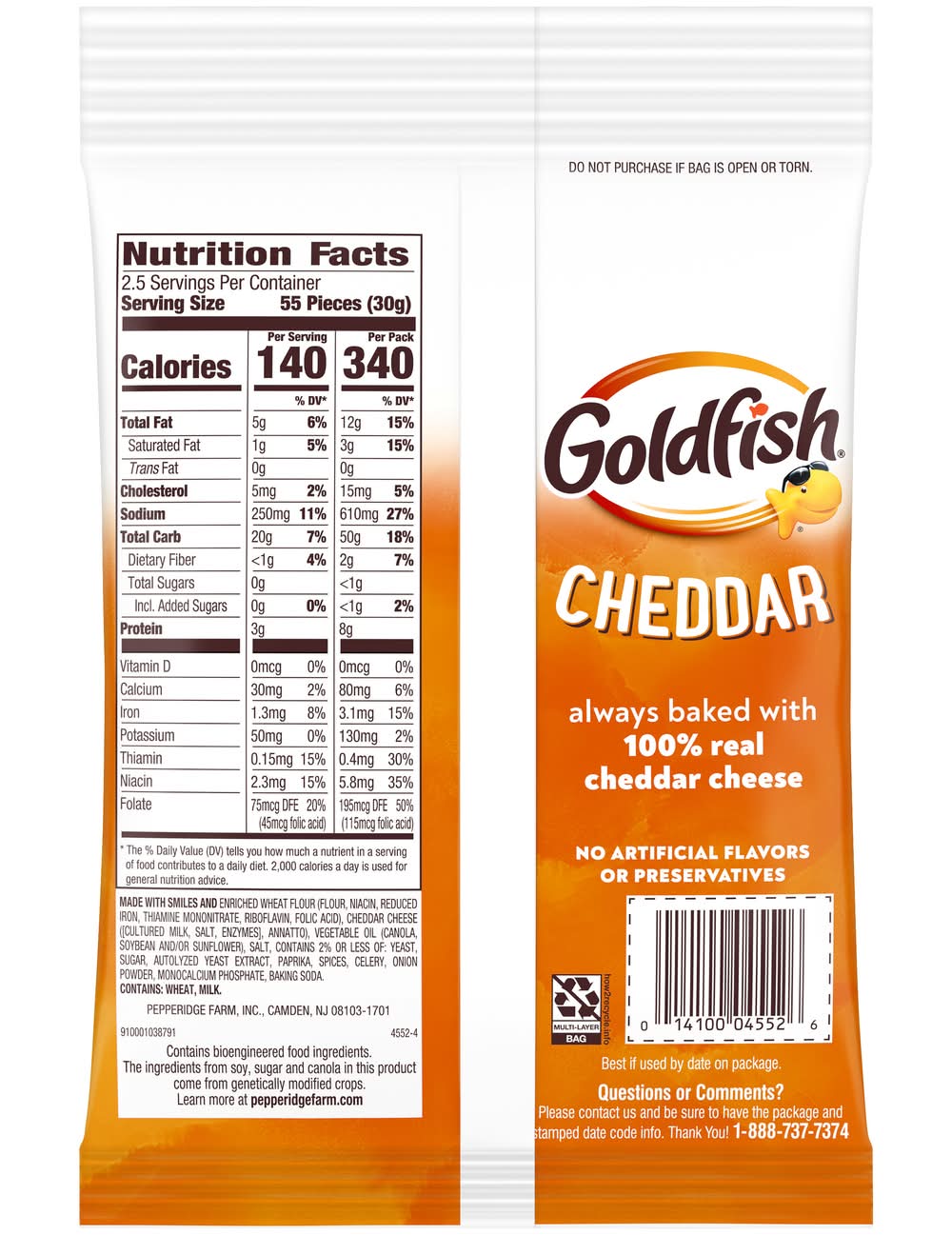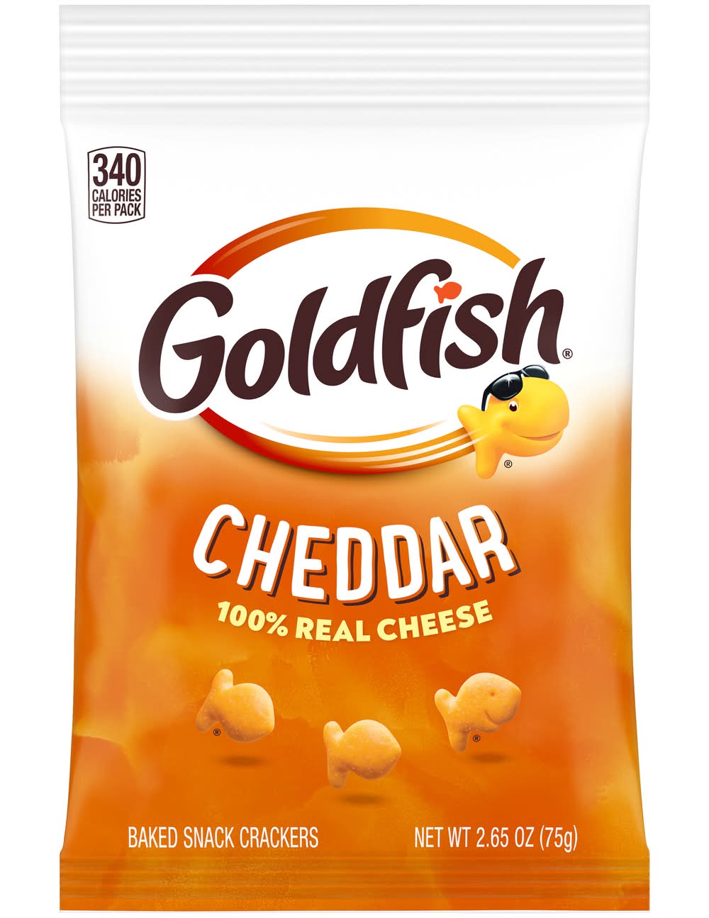 The irresistible little snack that always delights! These munchable, crunchable Goldfish Cheddar snack crackers are always baked. They’re made with 100% real with no artificial flavors or preservatives. Talk about a feel-good snack! These playful, tasty bites make snack time something to look forward to. Goldfish Cheddar snack crackers are great for lunch as well as munching. You can add them to soups or add them as a side with your sandwich. That’s all it takes to whip up a meal that’s tasty and fun! Kids and adults alike love that one-of-a-kind cheese flavor, so Goldfish Cheddar crackers are sure to be a big hit with everyone. And the handy, Pack is ideal when you or anyone else in the family is on-the-go and wants something satisfying to crunch on. That means in the car, at a picnic, or in your backpack for later. When you’re craving something delicious, go for the handful! • Brand: Pepperidge farm • Flavor: Cheddar