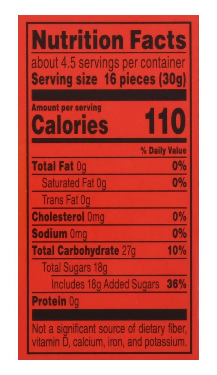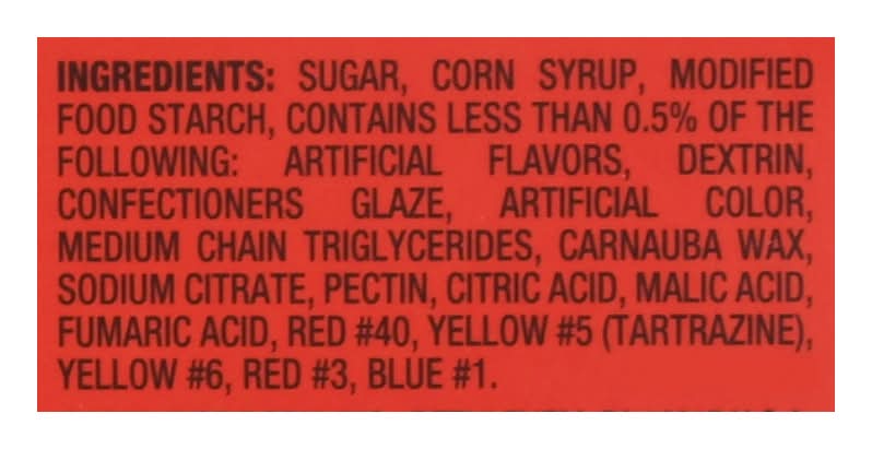 Ingredients: Sugar, Corn Syrup, Modified Food Starch, Contains Less than 0.5% of the Following: Artificial Flavors, Dextrin, Confectioners Glaze, Artificial Color, Medium Chain Triglycerides, Carnauba Wax, Sodium Citrate, Pectin, Citric Acid, Malic Acid, Fumaric Acid, Red 40, Yellow 5 (Tartrazine), Yellow 6, Red 3, Blue 1