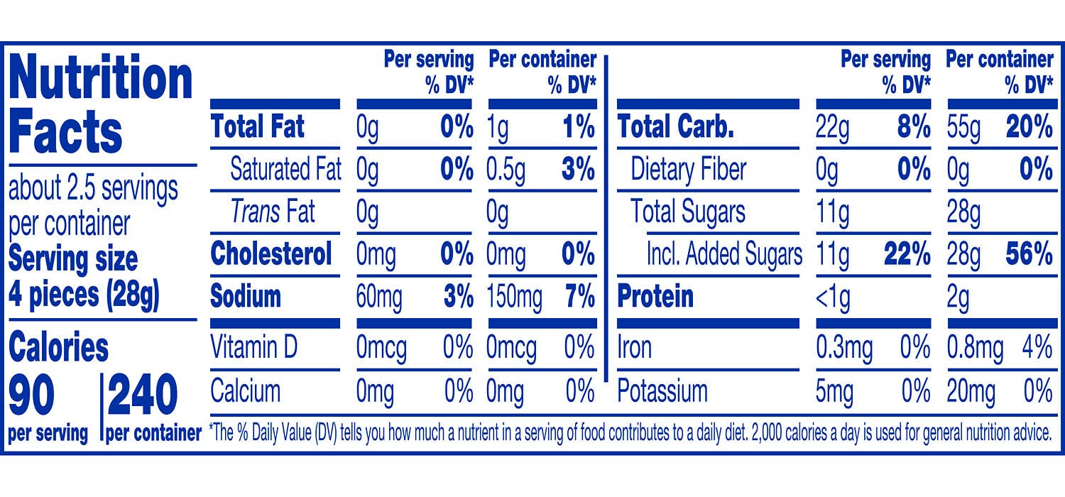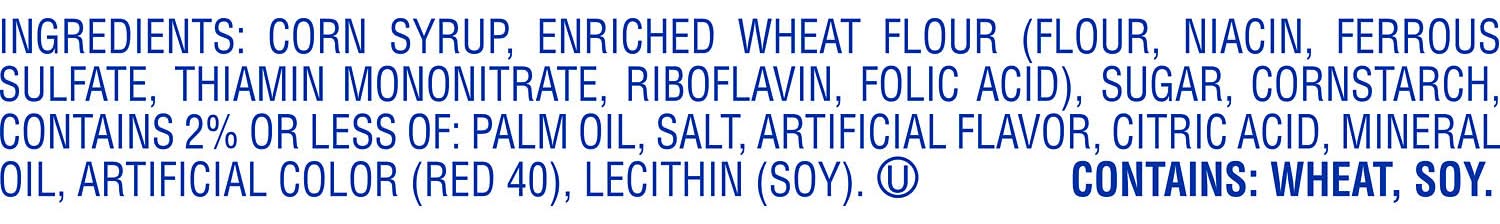 Ingredients: CORN SYRUP, ENRICHED WHEAT FLOUR (FLOUR, NIACIN, FERROUS SULFATE, THIAMIN MONONITRATE, RIBOFLAVIN, FOLIC ACID), SUGAR, CORNSTARCH, CONTAINS 2% OR LESS OF: PALM OIL, SALT, ARTIFICIAL FLAVOR, CITRIC ACID, MINERAL OIL, ARTIFICIAL COLOR (RED 40), LECITHIN (SOY), . Contains: Contains: Soy|Wheat