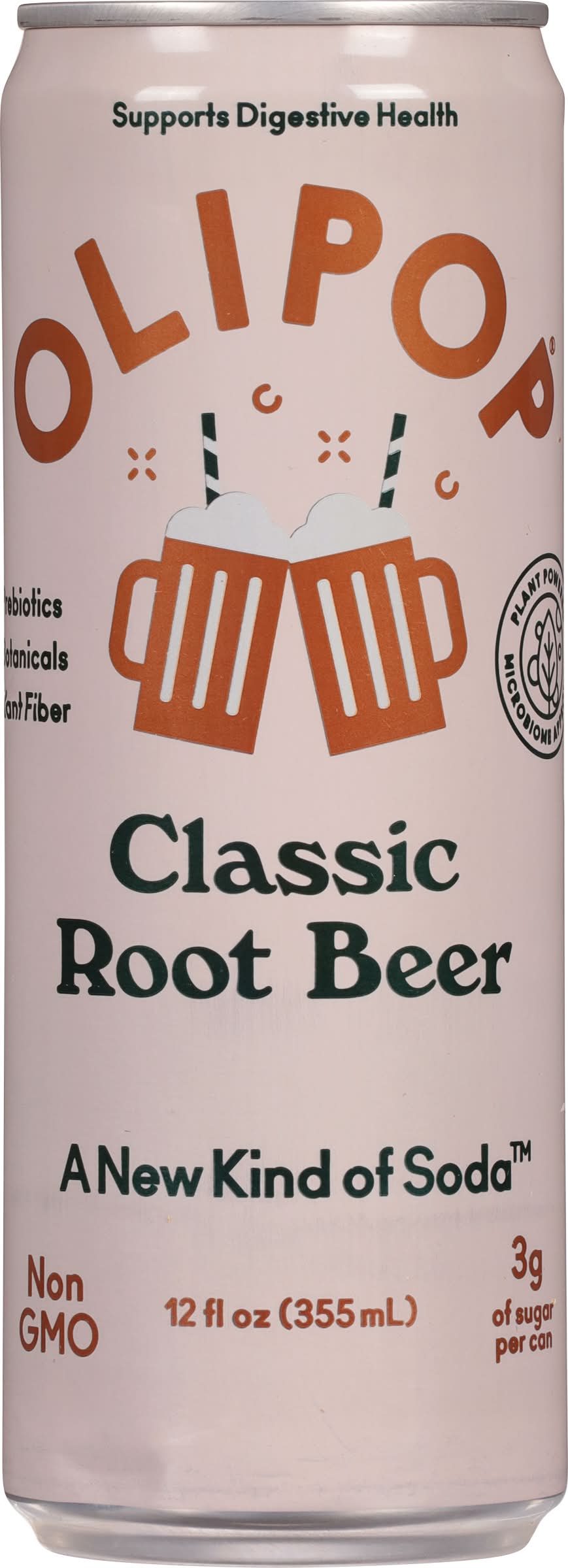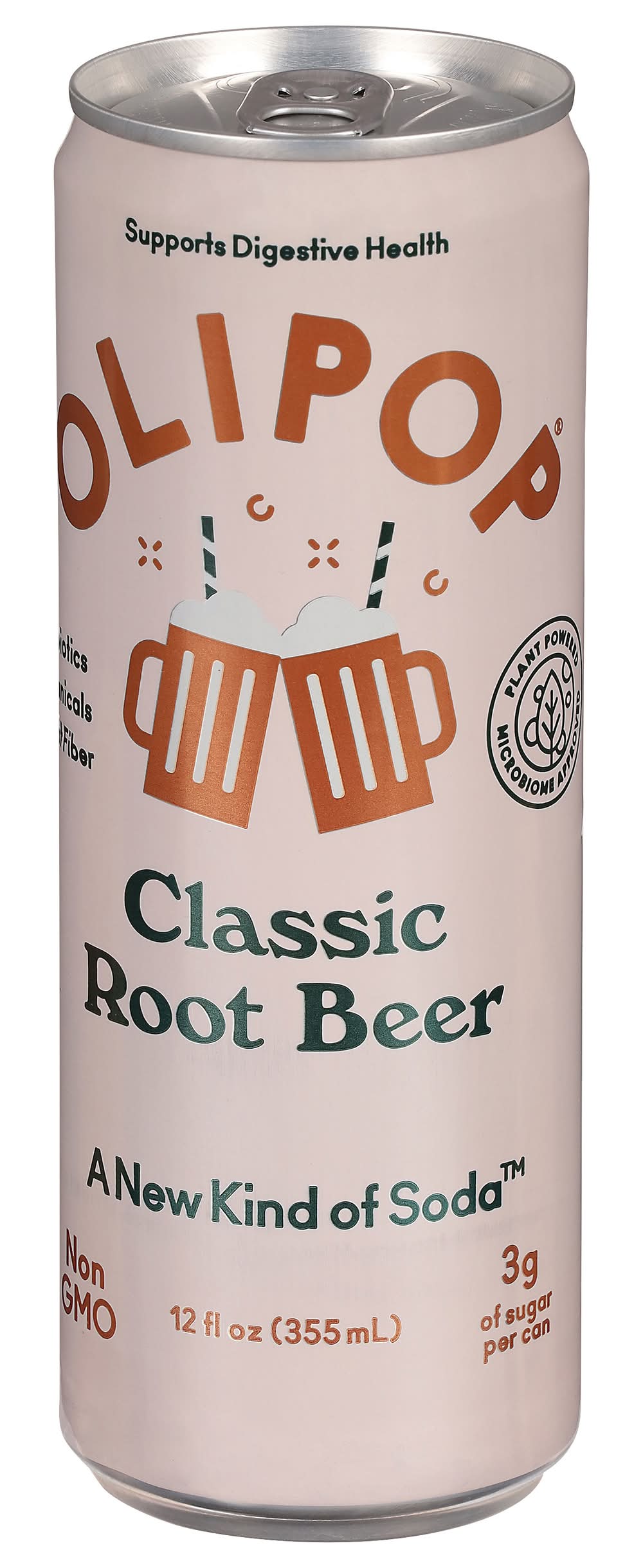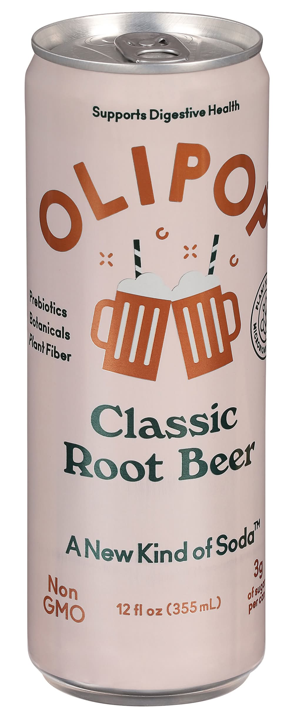 A plant-based soda that combines a classic root beer taste with prebiotics, fiber, and botanicals. It's designed to support digestive health and the microbiome. • Brand: Olipop • gluten-free, vegan, GMO-free • Packaging: Reusable