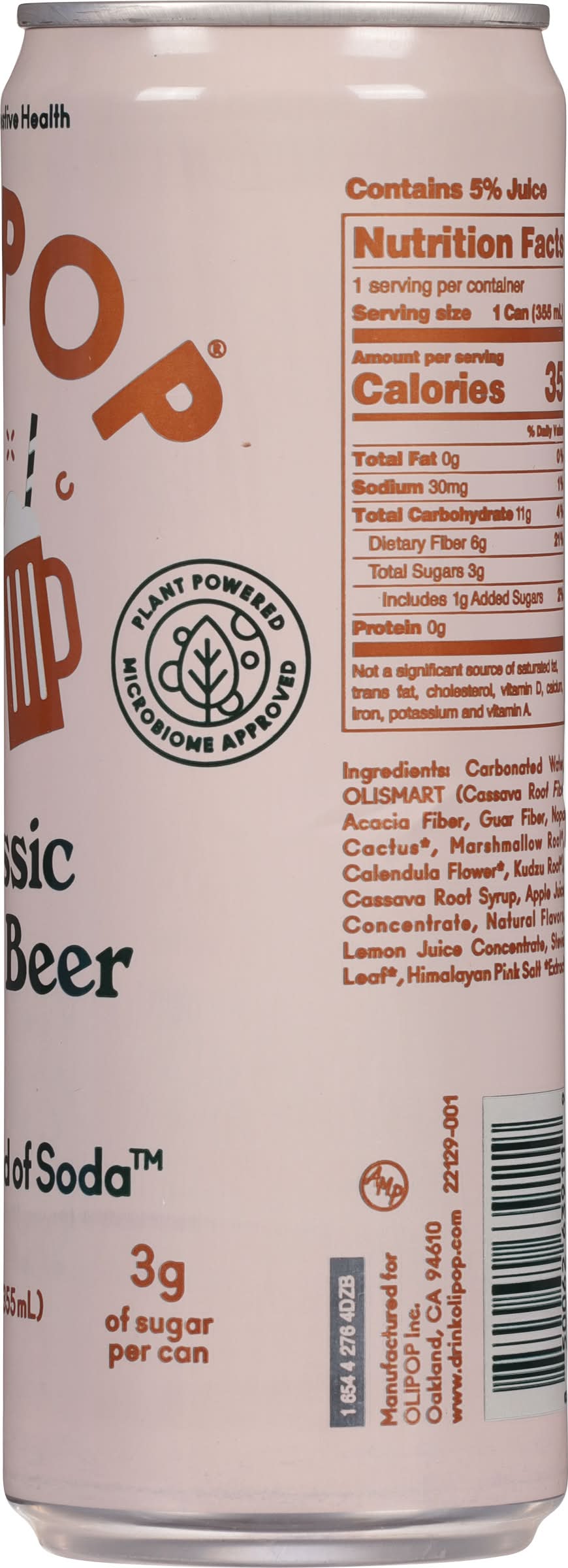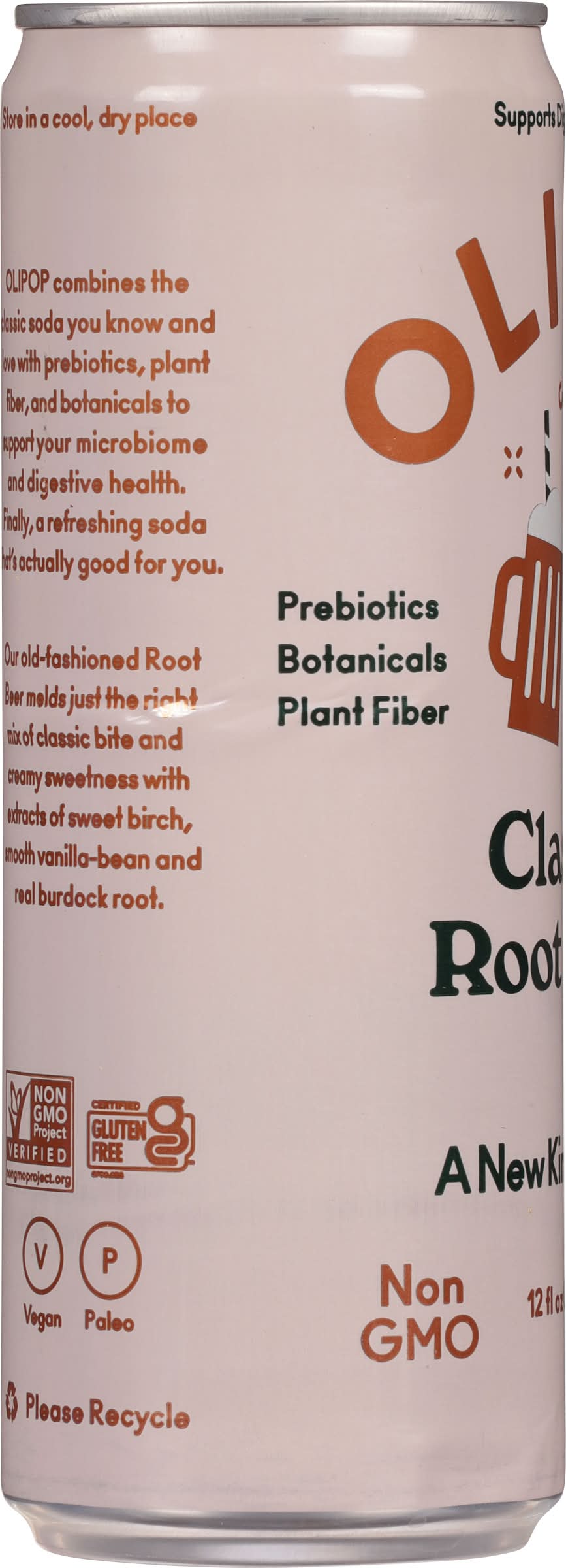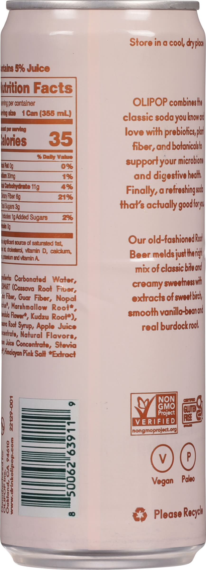 A plant-based soda that combines a classic root beer taste with prebiotics, fiber, and botanicals. It's designed to support digestive health and the microbiome. • Brand: Olipop • gluten-free, vegan, GMO-free • Packaging: Reusable
