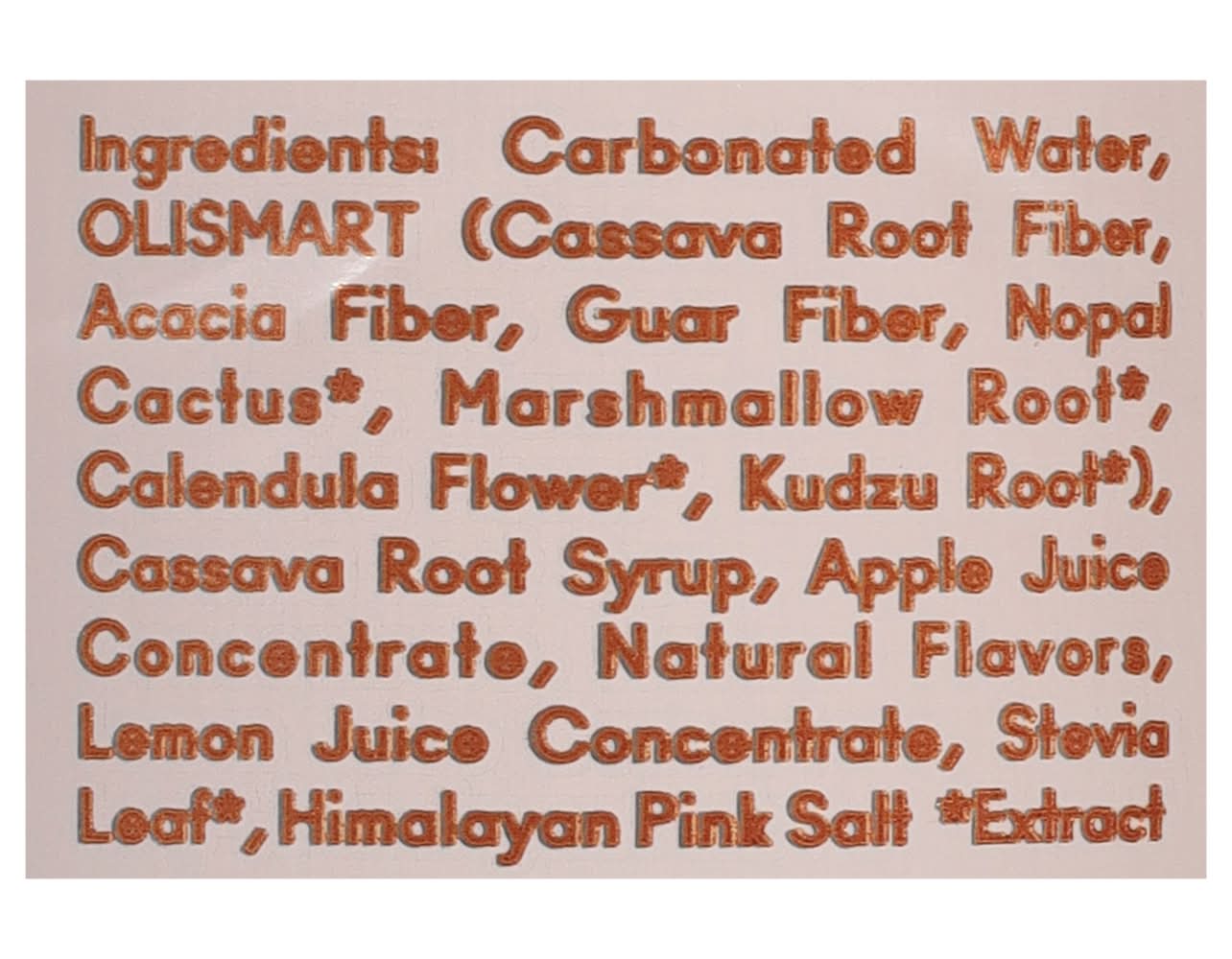 Ingredients: Carbonated Water, Olismart (Cassava Root Fiber, Acacia Fiber, Guar Fiber, Nopal Cactus*, Marshmallow Root*, Calendula Flower*, Kudzu Root*), Cassava Root Syrup, Apple Juice Concentrate, Natural Flavors, Lemon Juice Concentrate, Stevia Leaf*, Himalayan Pink Salt. *Extract