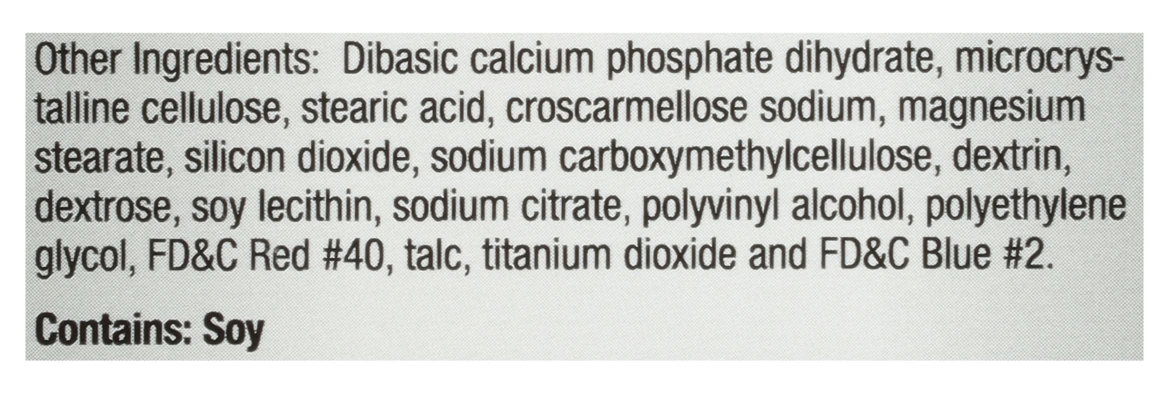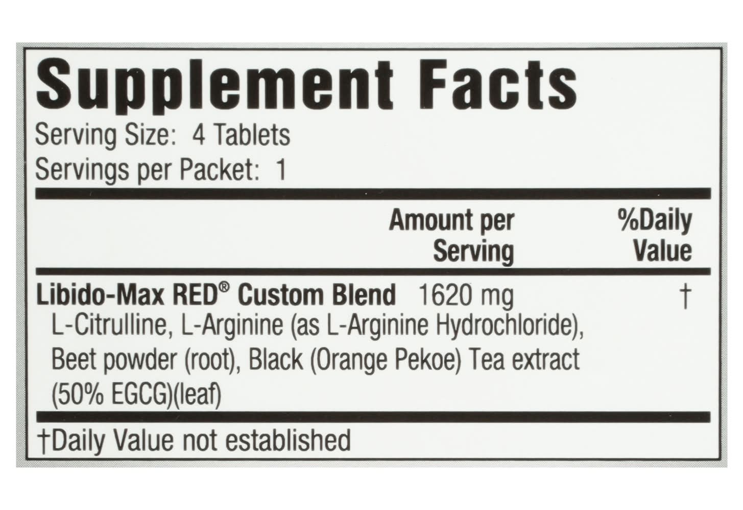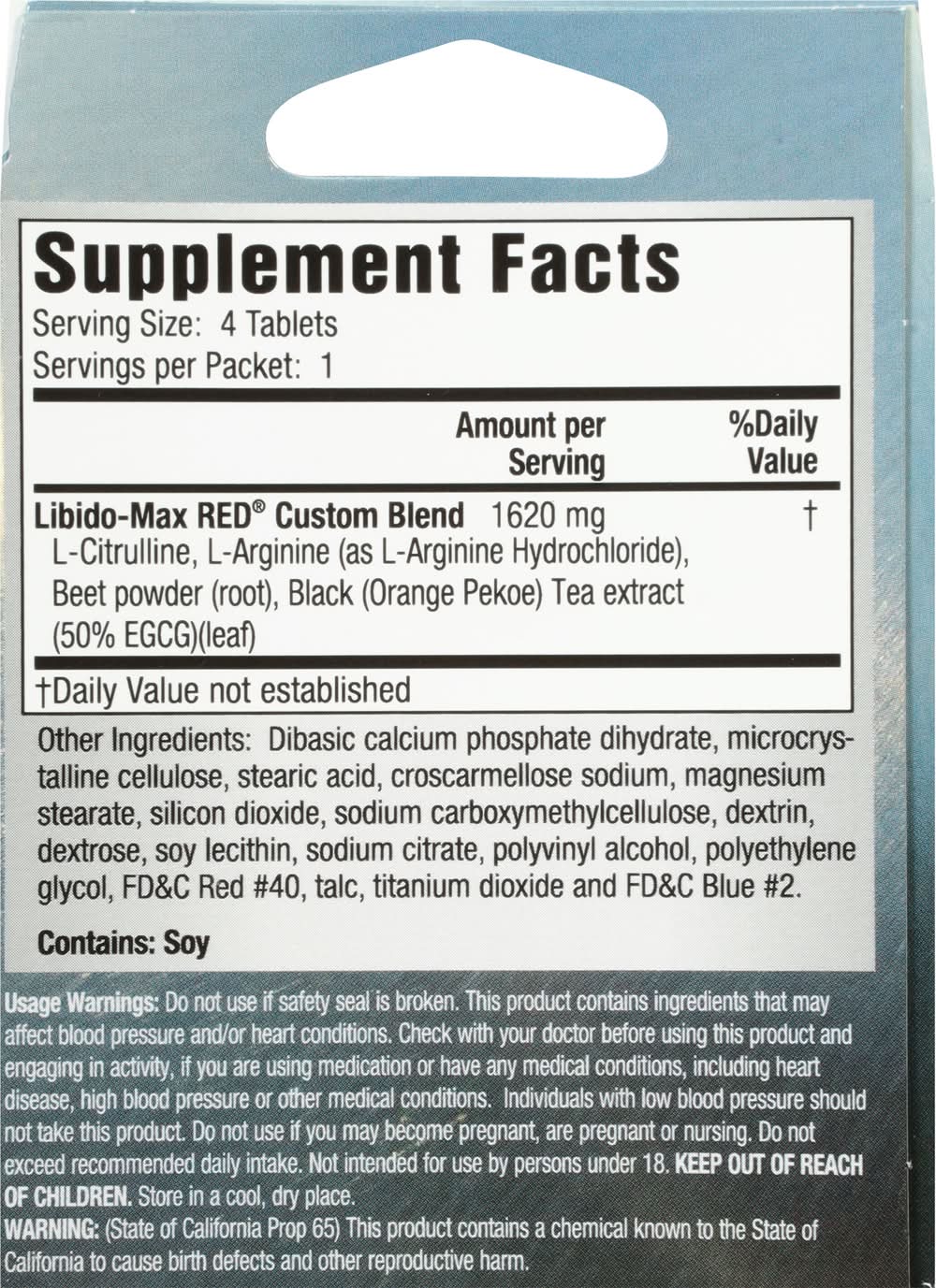 Ingredients: Libido-Max Custom Blend: L-Citrulline, L-Arginine (as L-Arginine Hydrochloride), Beet Powder (Root), Black (Orange Pekoe) Tea Extract (50% EGCG) (Leaf). Other Ingredients: Dibasic Calcium Phosphate Dihydrate, Microcrystalline Cellulose, Stearic Acid, Croscarmellose Sodium, Magnesium Stearate, Silicon Dioxide, Sodium Carboxymethylcellulose, Dextrin, Dextrose, Soy Lecithin, Sodium Citrate, Polyvinyl Alcohol, Polyethylene Glycol, FD&C Red #40, Talc, Titanium Dioxide and FD&C Blue #2 Contains: Soybeans
