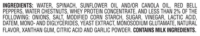 Ingredients: Water, Spinach, Sunflower Oil and/or Canola Oil, Red Bell Peppers, Water Chestnuts, Whey Protein Concentrate, and Less than 2% of the Following: Onions, Modified Tapioca and Corn Starch, Salt, Sugar, Vinegar, Garlic Powder, Lactic Acid, Natural Flavor, Xanthan Gum, DATEM, Torula Yeast Extract, Monosodium Glutamate, and Citric Acid Contains: Milk