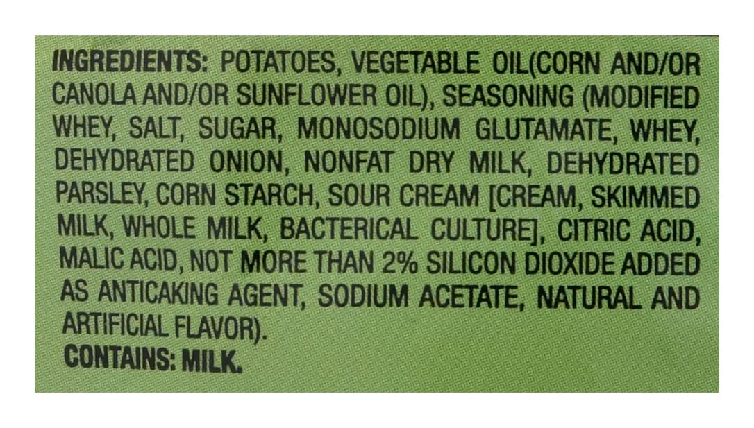 Ingredients: Potatoes, Vegetable Oil (Corn and/or Canola and/or Sunflower Oil), Seasoning (Modified Whey, Salt, Sugar, Monosodium Glutamate, Whey, Dehydrated Onion, Nonfat Dry Milk, Dehydrated Parsley, Corn Starch, Sour Cream [Cream, Skimmed Milk, Whole Milk, Bacterial Culture], Citric Acid, Malic Acid, Not More than 2% Silicon Dioxide Added as Anticaking Agent, Sodium Acetate, Natural and Artificial Flavor) Contains: Milk