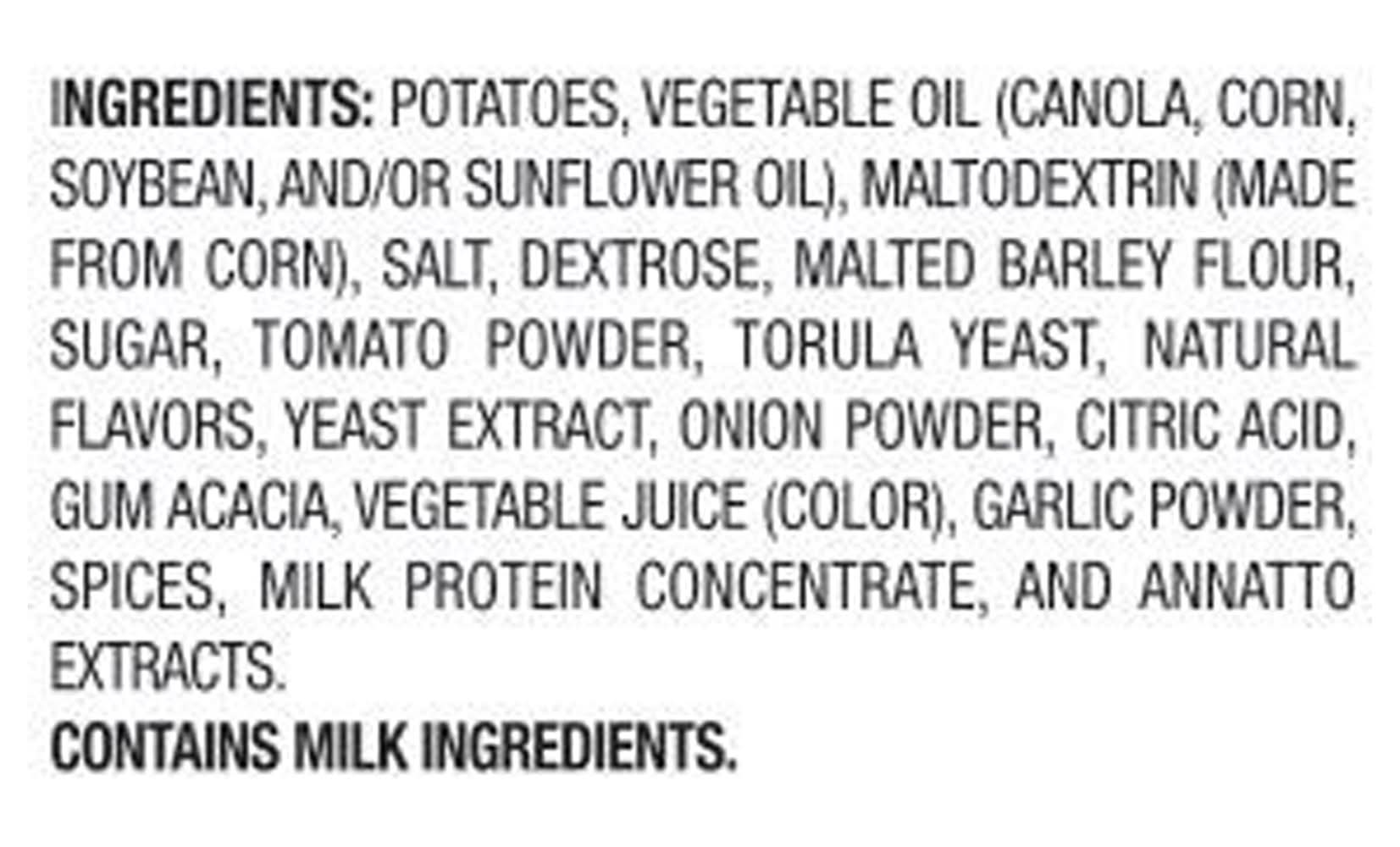 Ingredients: Potatoes, Vegetable Oil (Canola, Corn, Soybean, and/or Sunflower Oil), Maltodextrin (Made from Corn), Salt, Dextrose, Malted Barley Flour, Sugar, Tomato Powder, Torula Yeast, Natural Flavors, Yeast Extract, Onion Powder, Citric Acid, Gum Acacia, Vegetable Juice (Color), Garlic Powder, Spices, Milk Protein Concentrate, and Annatto Extracts Contains: Milk, Barley, Soybeans