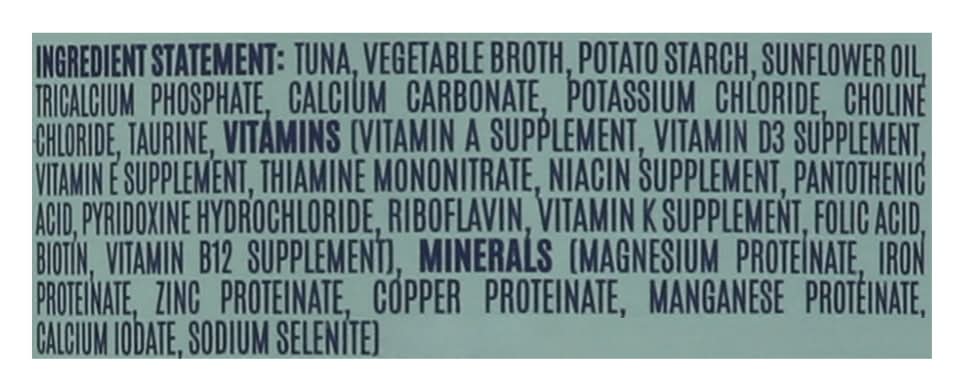 Ingredients: Tuna, Vegetable Broth, Potato Starch, Sunflower Oil, Tricalcium Phosphate, Calcium Carbonate, Potassium Chloride, Choline Chloride, Taurine, Vitamins (Vitamin A Supplement, Vitamin D3 Supplement, Vitamin E Supplement, Thiamine Mononitrate, Niacin Supplement, Pantothenic Acid, Pyridoxine Hydrochloride, Riboflavin, Vitamin K Supplement, Folic Acid, Biotin, Vitamin B12 Supplement), Minerals (Magnesium Proteinate, Iron Proteinate, Zinc Proteinate, Copper Proteinate, Manganese Proteinate, Calcium Iodate, Sodium Selenite) Contains: Fish, Tuna