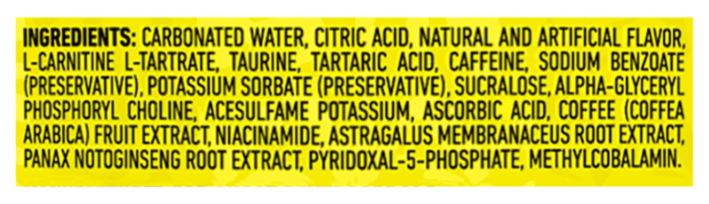 Ingredients: Carbonated Water, Citric Acid, Natural and Artificial Flavor, Acetyl-L-Carnitine HCl, Taurine, Tartaric Acid, Natural Caffeine from Coffee Bean, Sodium Benzoate Preservative, Potassium Sorbate Preservative, Sucralose, Alpha-Gpc Alpha-Glyceryl Phosphoryl Choline 50%, Ascorbic Acid, Acesulfame Potassium, Neurofactorth Coffee Coffea Arabica Fruit Extract, Astragin 10:1 Astragalus Membranace煤s and 50:1 Panax Notoginseng Root Extracts, Niacinamide, D-Calcium Pantothenate, Biotin, Pyrid贸xine HCl, Thiamine HCl, Folic Acid, Cyanocobalamin.