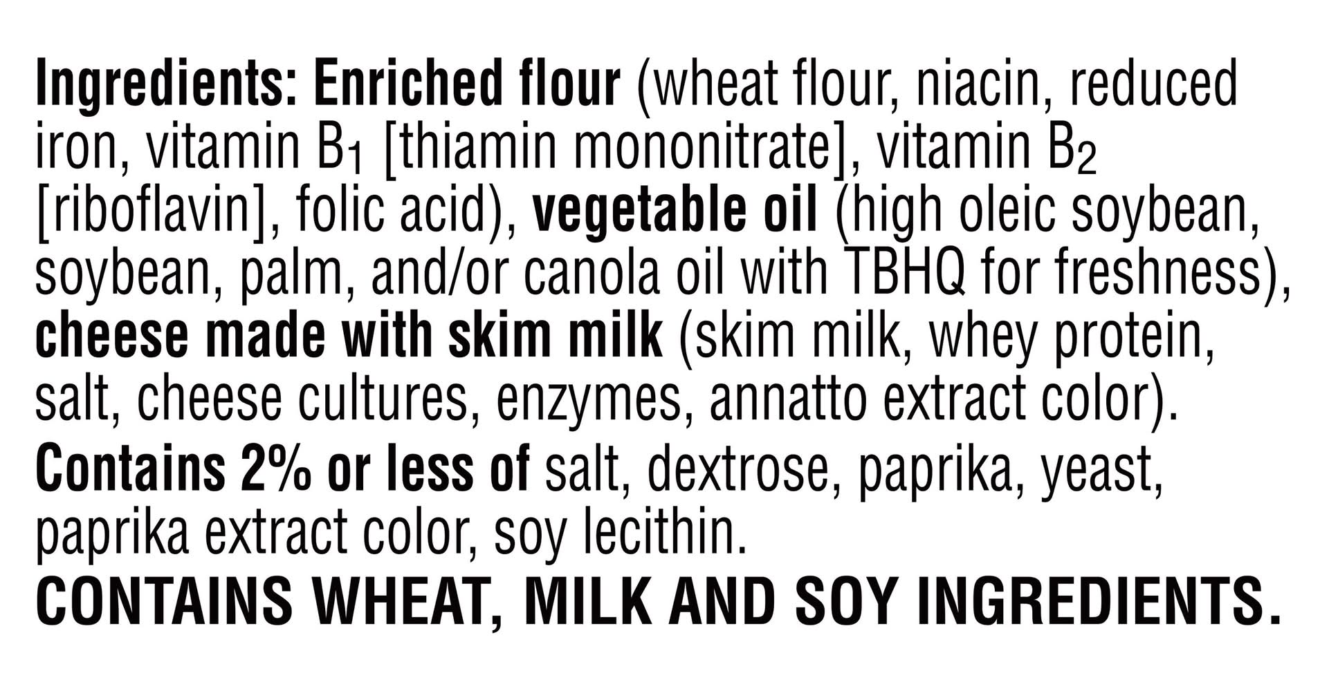 Ingredients: Enriched Flour (Wheat Flour, Niacin, Reduced Iron, Vitamin B1 [Thiamin Mononitrate], Vitamin B2 [Riboflavin], Folic Acid), Vegetable Oil (High Oleic Soybean, Soybean, Palm, and/or Canola Oil with TBHQ for Freshness), Cheese Made with Skim Milk (Skim Milk, Whey Protein, Salt, Cheese Cultures, Enzymes, Annatto Extract Color). Contains 2% or Less of Salt, Dextrose, Paprika, Yeast, Paprika Extract Color, Soy Lecithin Contains: Wheat, Milk, Soybeans