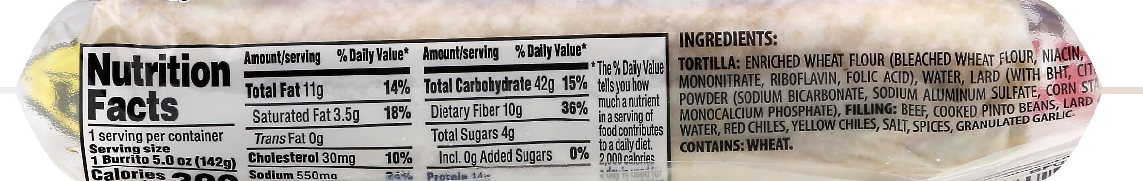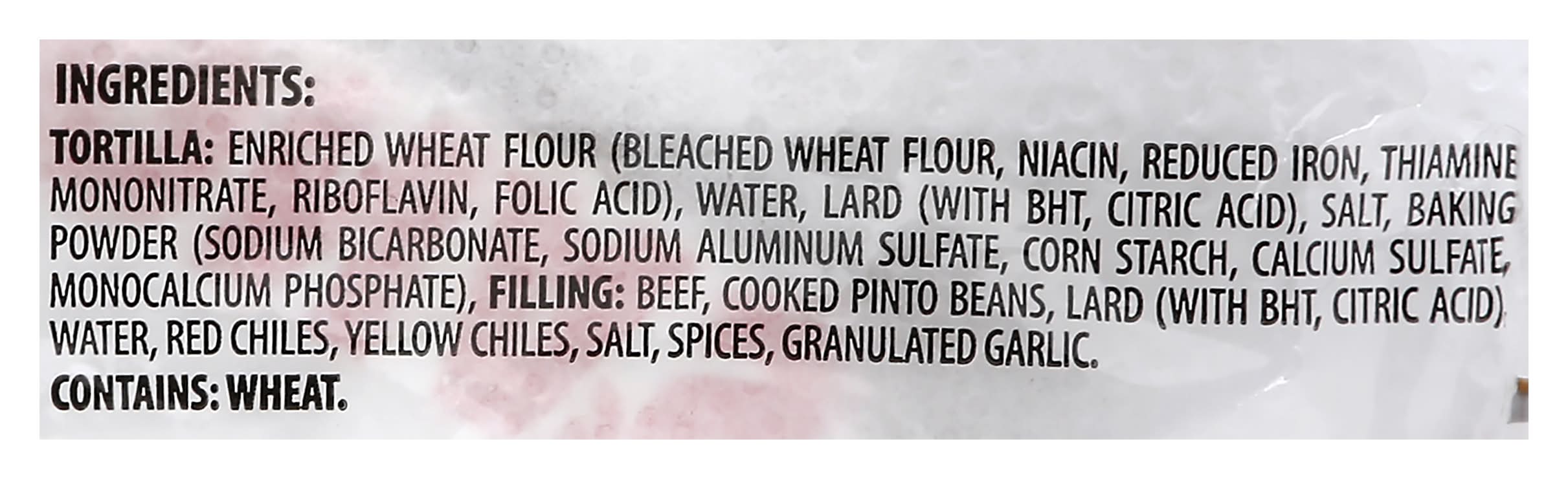 Ingredients: Tortilla: Enriched Wheat Flour (Bleached Wheat Flour, Niacin, Reduced Iron, Thiamine Mononitrate, Riboflavin, Folic Acid), Water, Lard (with BHT, Citric Acid), Salt, Baking Powder (Sodium Bicarbonate, Sodium Aluminum Sulfate, Corn Starch, Calcium Sulfate, Monocalcium Phosphate), Filling: Beef, Cooked Pinto Beans, Lard (with BHT, Citric Acid) Water, Red Chiles, Yellow Chiles, Salt, Spices, Granulated Garlic Contains: Wheat