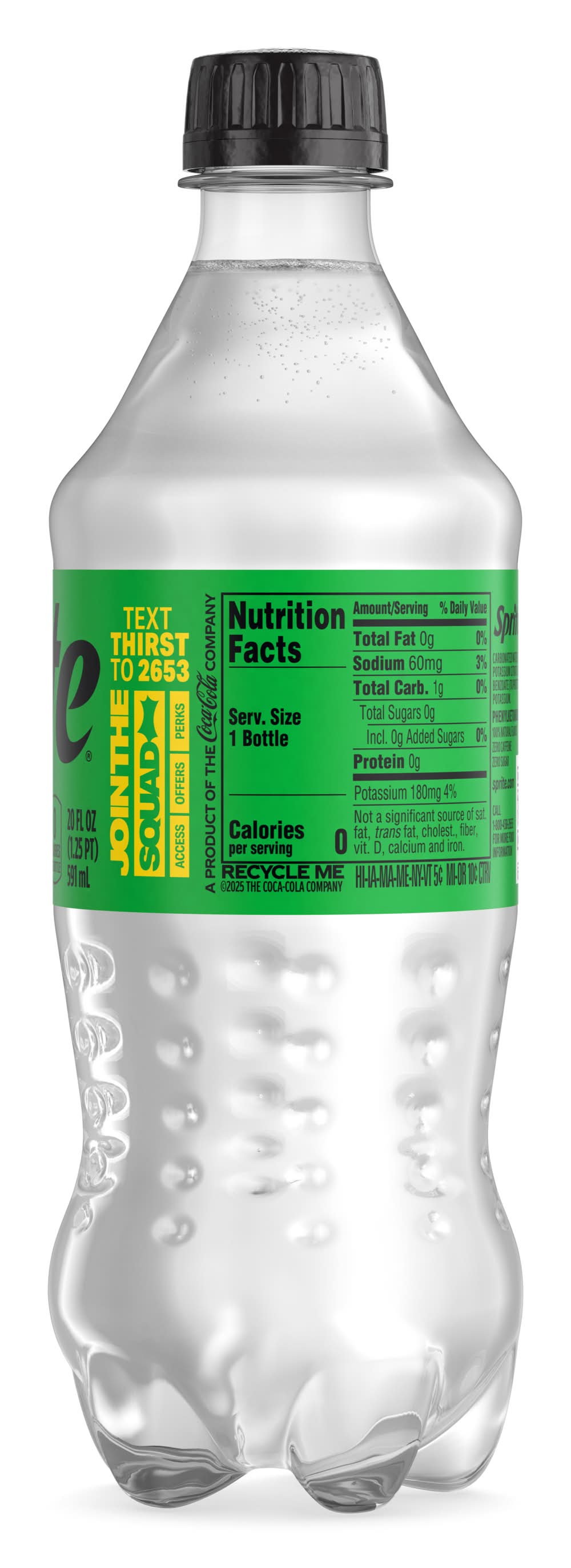 100% natural flavors. Zero calories. 0 calories per bottle. • Brand: Sprite • Flavor: Lemon-lime • The Coca-Cola Company, Atlanta,GA,30327 • Packaging: Reusable