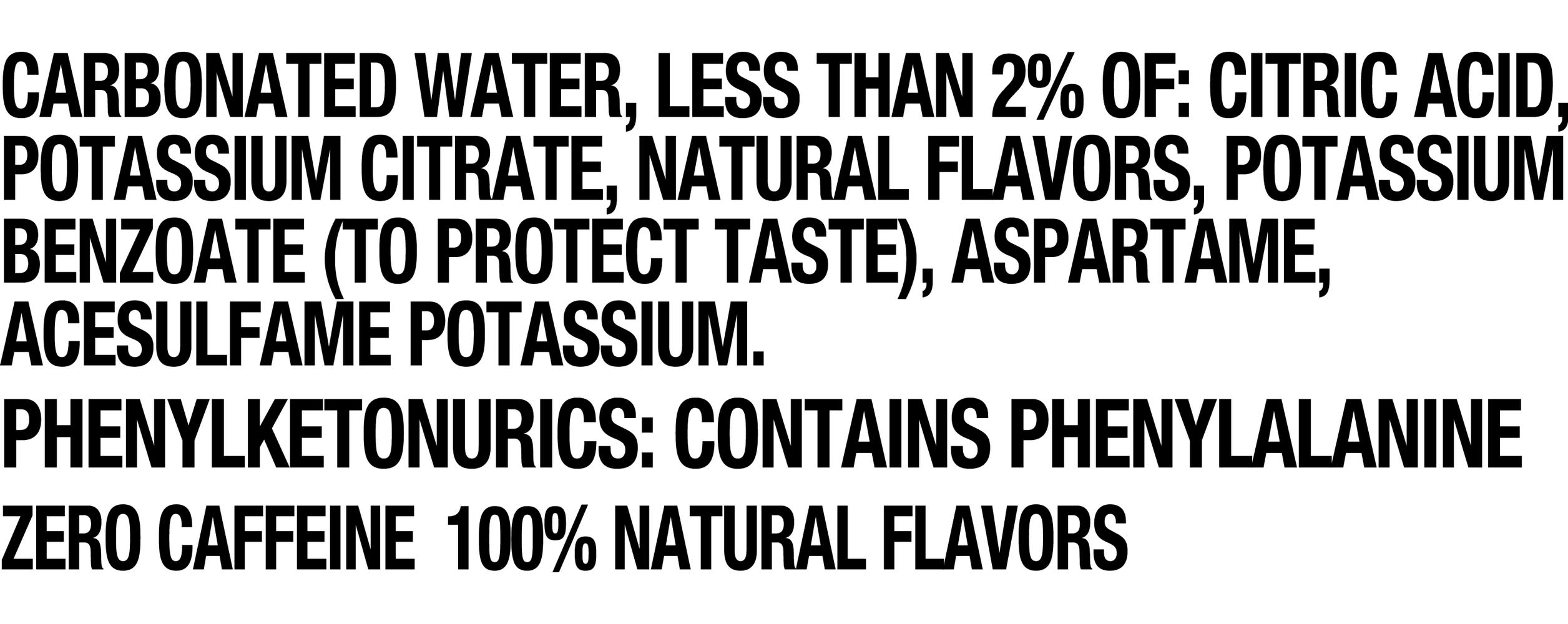 Ingredients: Carbonated Water, Citric Acid, Potassium Citrate, Natural Flavors, Potassium Benzoate (to Protect Taste), Aspartame, Acesulfame Potassium
