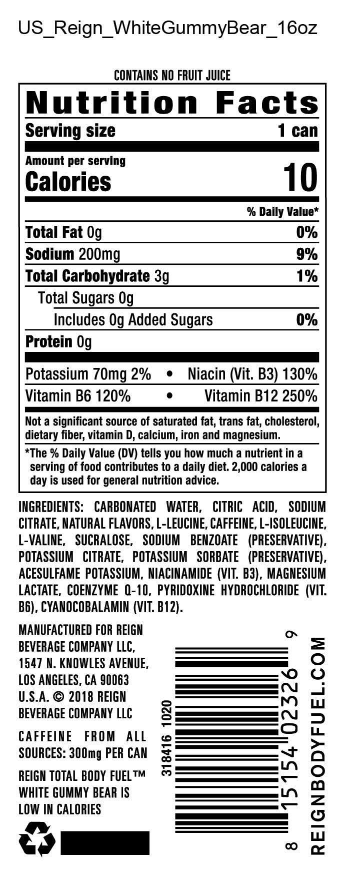 Reign Total Body Fuel white gummy bear is low in calories. BCAA Aminos. Increased concentration. Reduced fatigue. Branched-chain amino acids. Coenzyme Q10. • Brand: Reign • Flavor: White gummy bear • low calorie, • Packaging: Reusable