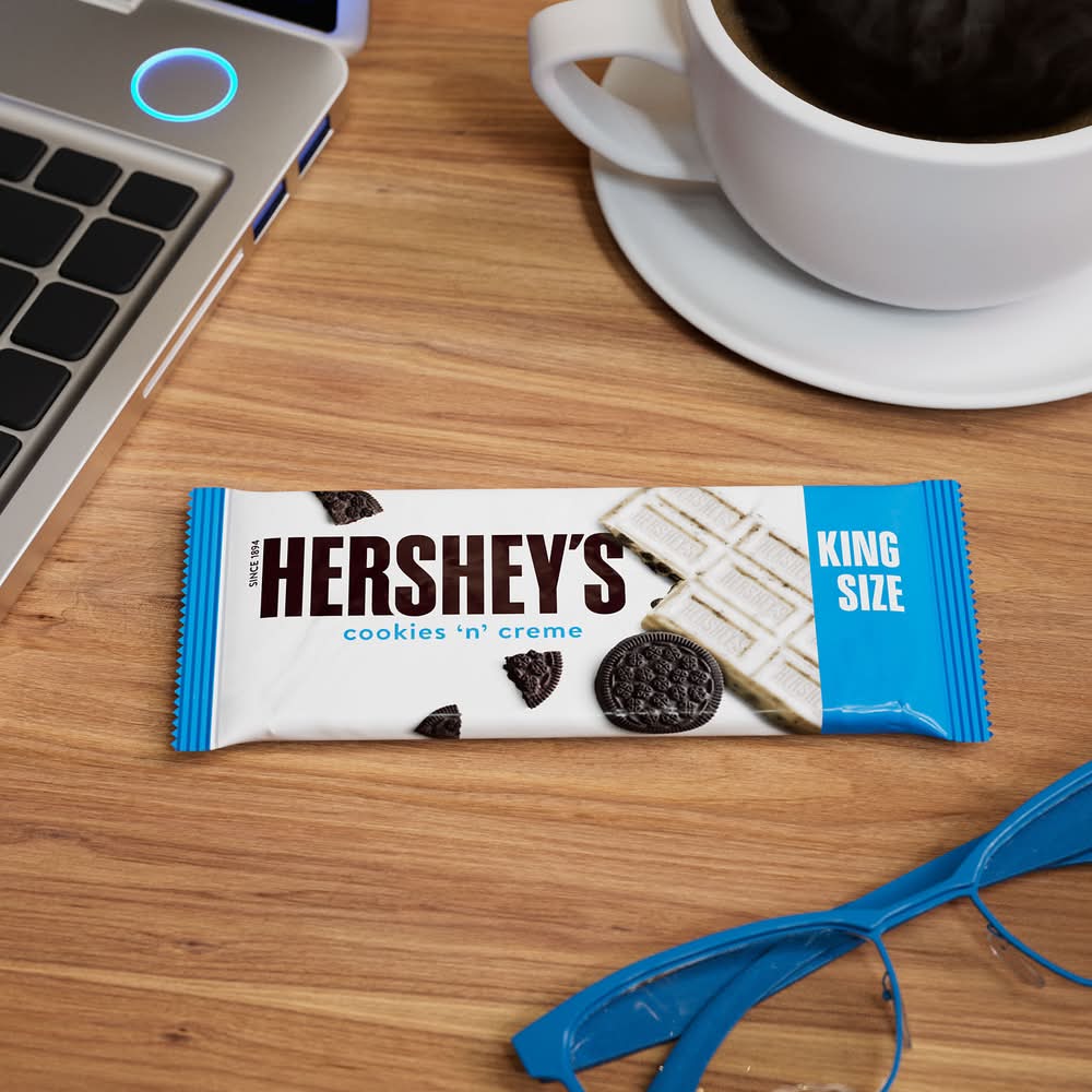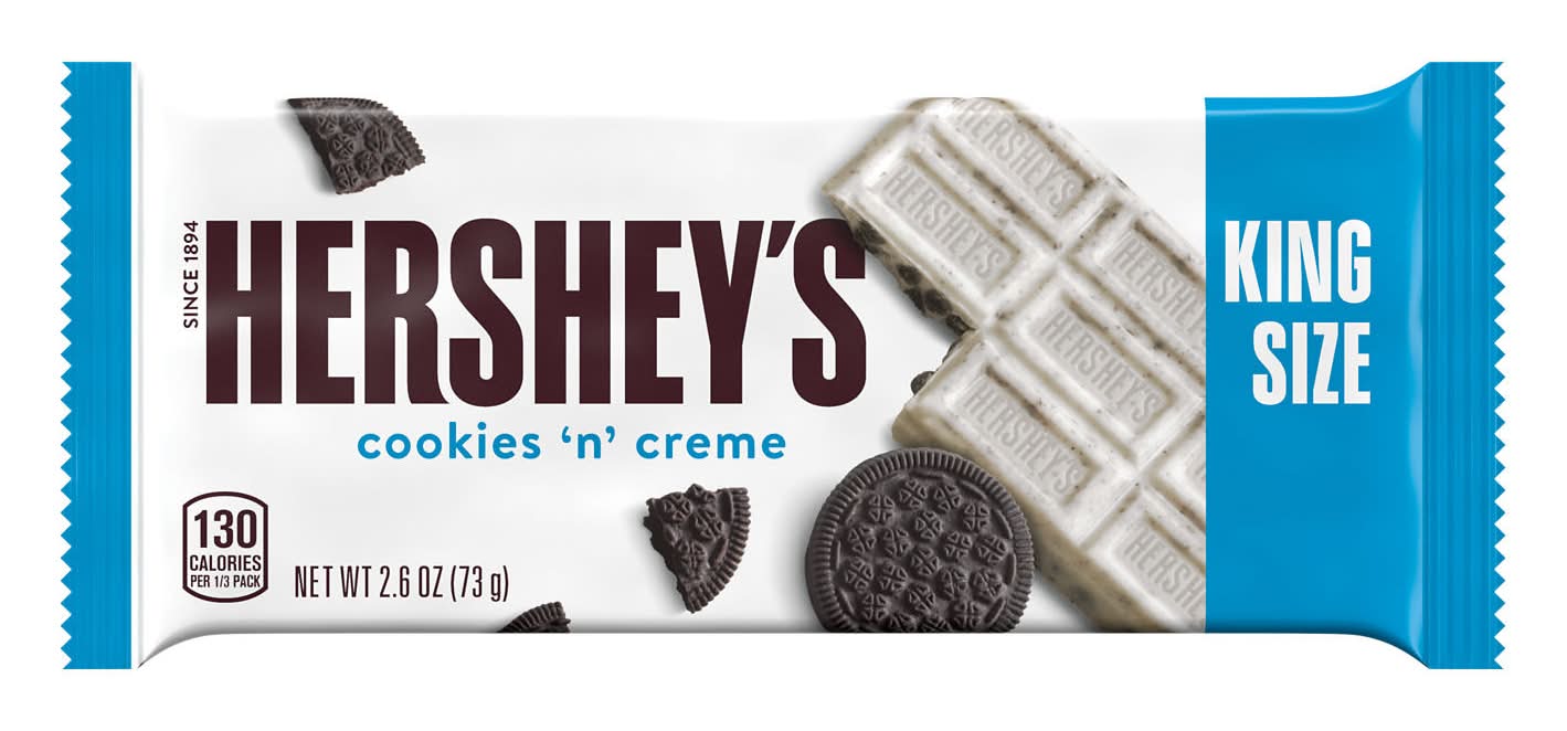 Looking for a twist on a classic candy bar? Look no further! HERSHEY'S Cookies 'n' Creme candy bars make life more delicious! Stock your pantry with king size bars or opt to share a bar with friends, family and everyone you love. These king size, kosher certified, individually wrapped candy bars offer a twist on the classic HERSHEY'S bar, and are the perfect treat for countless special and everyday occasions. Enjoy a smooth white creme base combined with crunchy chocolate cookie pieces. It's a sweet treat that offers delicious indulgence in every bite. Keep some on hand for guests and store a few in your pantry for convenient snacking when the mood strikes. Show up to movie night with HERSHEY'S Cookies 'n' Creme king size candy bars to share with attendees and please the whole crowd. You can also pop pieces of these candy bars into a bucket of popcorn for a sweet and salty combo. Or sweeten up your favorite homemade recipes by using these candy bars on top of freshly baked cakes, cookies and cupcakes. We're getting hungry just thinking about it! Everyone is excited when they're reaching for HERSHEY'S Cookies 'n' Creme candy bars, and now you can be, too! • Brand: Hershey's • Flavor: Cookies-cream • Number of servings: 3 • The Hershey Company, Hershey, PA, 17033-0815
