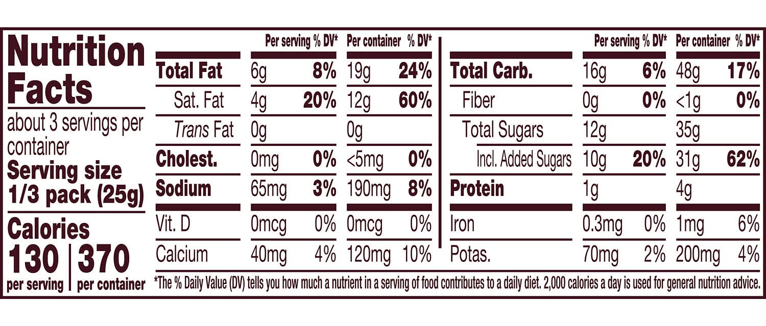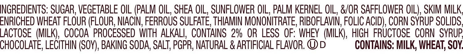 Ingredients: SUGAR, VEGETABLE OIL (PALM OIL, SHEA OIL, SUNFLOWER OIL, PALM KERNEL OIL, /OR SAFFLOWER OIL), SKIM MILK, ENRICHED WHEAT FLOUR (FLOUR, NIACIN, FERROUS SULFATE, THIAMIN MONONITRATE, RIBOFLAVIN, FOLIC ACID), CORN SYRUP SOLIDS, LACTOSE (MILK), COCOA PROCESSED WITH ALKALI, CONTAINS 2% OR LESS OF: WHEY (MILK), HIGH FRUCTOSE CORN SYRUP, CHOCOLATE, LECITHIN (SOY), BAKING SODA, SALT, PGPR, NATURAL ARTIFICIAL FLAVOR. Contains: Contains: Wheat|Soy|Milk