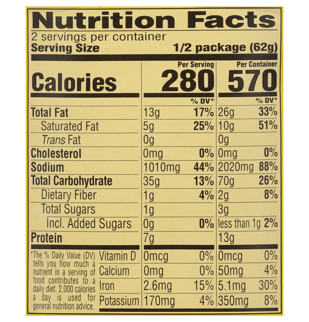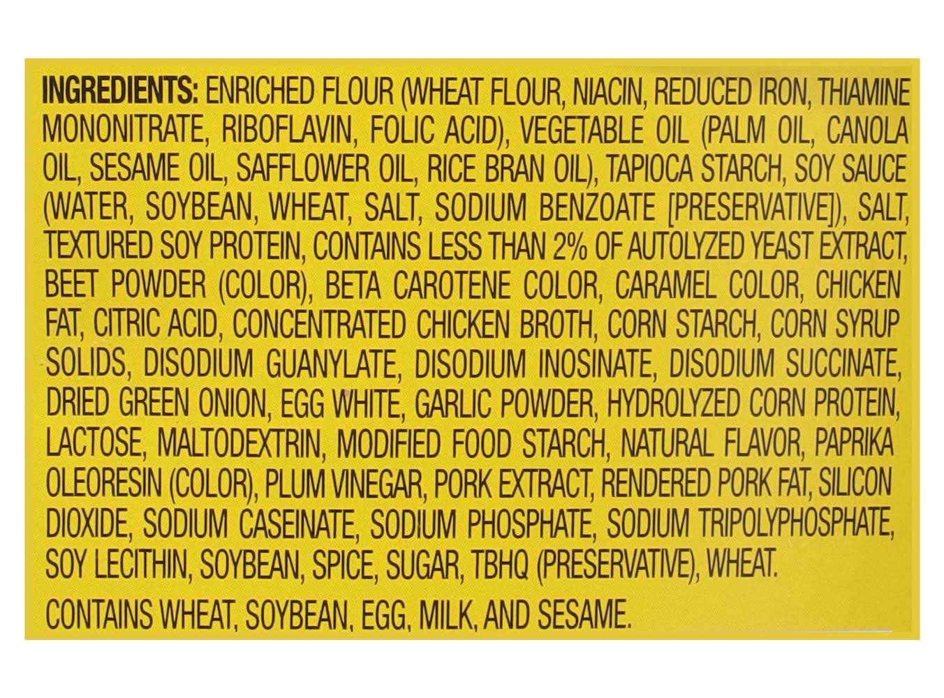 Ingredients: Enriched Flour (Wheat Flour, Niacin, Reduced Iron, Thiamine Mononitrate, Riboflavin, Folic Acid), Vegetable Oil (Palm Oil, Canola Oil, Sesame Oil, Safflower Oil, Rice Bran Oil), Tapioca Starch, Soy Sauce (Water, Soybean, Wheat, Salt, Sodium Benzoate [Preservative]), Salt, Textured Soy Protein, Contains Less than 2% of Autolyzed Yeast Extract, Beet Powder (Color), Beta Carotene Color, Caramel Color, Chicken Fat, Citric Acid, Concentrated Chicken Broth, Corn Starch, Corn Syrup Solids, Disodium Guanylate, Disodium Inosinate, Disodium Succinate, Dried Green Onion, Egg White, Garlic Powder, Hydrolyzed Corn Protein, Lactose, Maltodextrin, Modified Food Starch, Natural Flavor, Paprika Oleoresin (Color), Plum Vinegar, Pork Extract, Rendered Pork Fat, Silicon Dioxide, Sodium Caseinate, Sodium Phosphate, Sodium Tripolyphosphate, Soy Lecithin, Soybean, Spice, Sugar, TBHQ (Preservative), Wheat Contains: Wheat, Eggs, Soybeans, Lactose, Milk, Sesame, Peanuts, Tree Nuts, Crustacean Shellfish, Fish