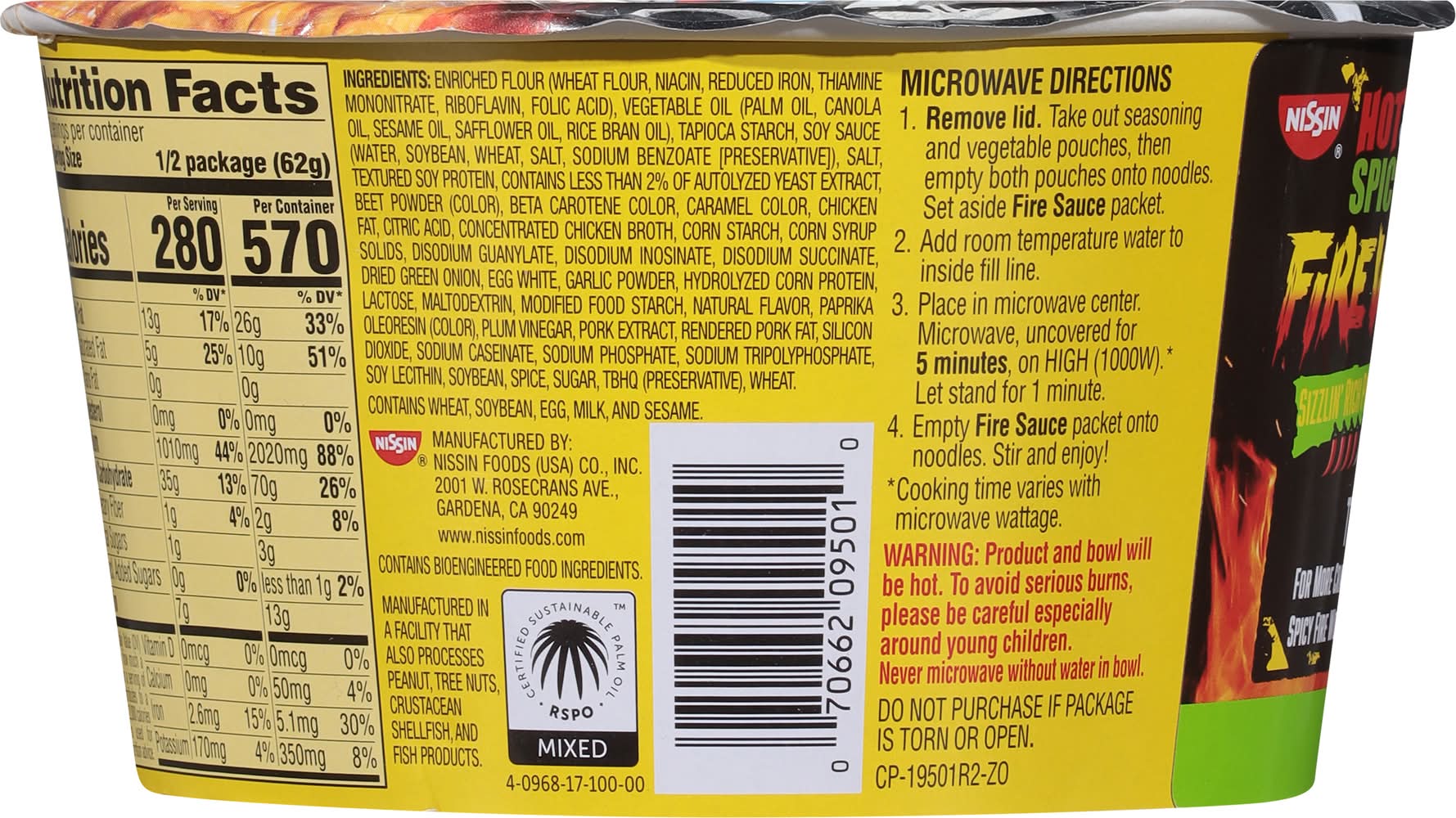 Asian noodles in sauce. Savor the flavor! Satisfying hearty noodles inspired by rich Japanese pork bone broth and spiced up with a kick of a chili pepper-infused sauce. No added msg (contains small amount of naturally occurring glutamates). Fire sauce packet included. 20% more noodles than our regular hot & spicy bowls. Try our other flavors! Scorchin' sesame shrimp flavor with other natural flavors. Molten chilli chicken flavor with ther natural flavors. Certified sustainable palm oil mixed. Rspo. • Brand: Nissin • Flavor: Sizzlin’ rich pork • Nissin Foods USA, 2001 W. Rosecrans Ave, Gardena, CA, 90249