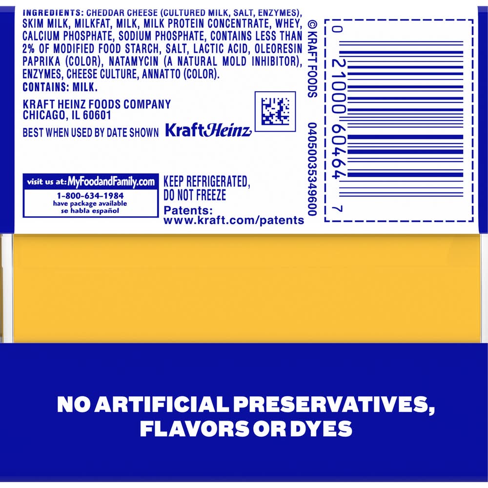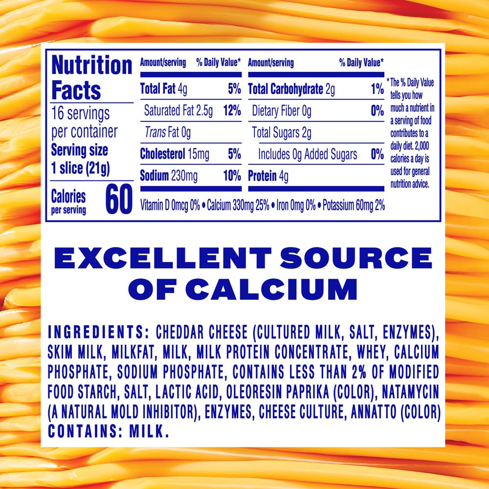Ingredients: CHEDDAR CHEESE (CULTURED MILK, SALT, ENZYMES), SKIM MILK, MILKFAT, MILK, MILK PROTEIN CONCENTRATE, WHEY, CALCIUM PHOSPHATE, SODIUM PHOSPHATE, CONTAINS LESS THAN 2% OF MODIFIED FOOD STARCH, SALT, LACTIC ACID, OLEORESIN PAPRIKA (COLOR), NATAMYCIN (A NATURAL MOLD INHIBITOR), ENZYMES, CHEESE CULTURE, ANNATTO (COLOR), . Contains: CONTAINS: MILK.