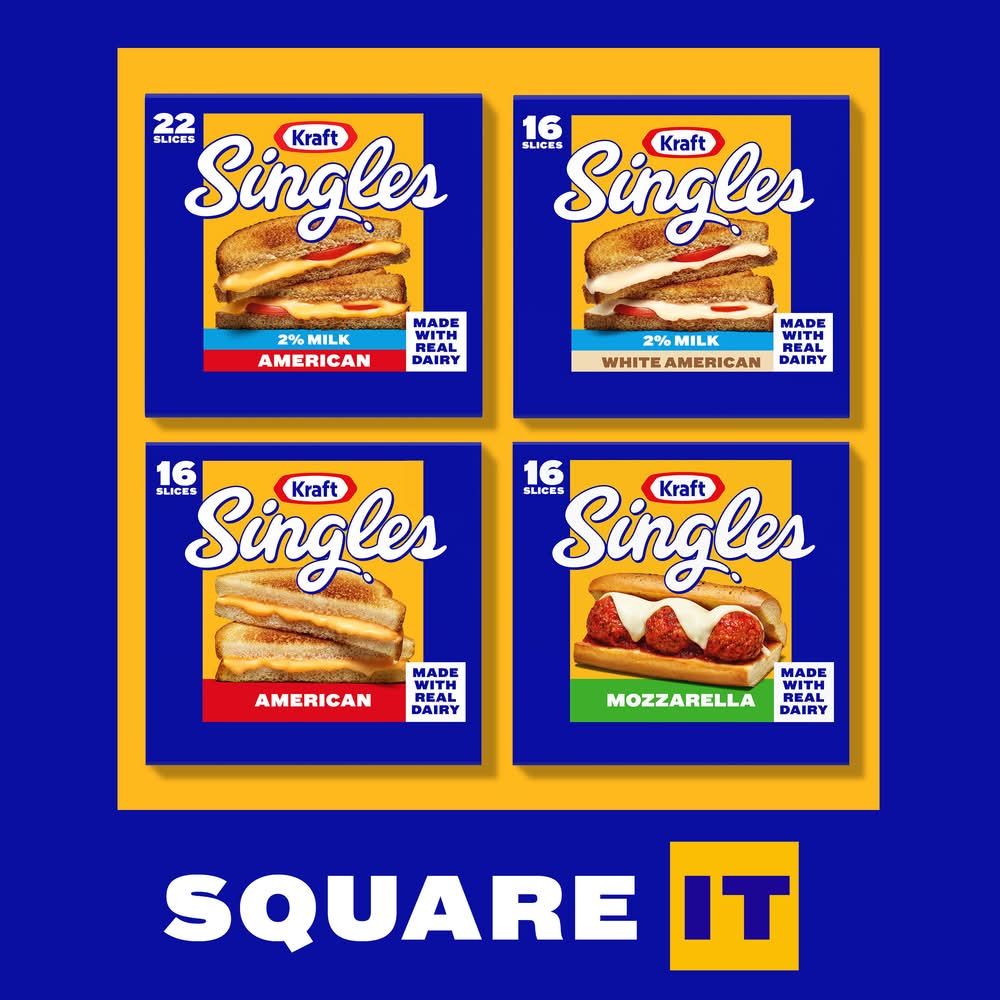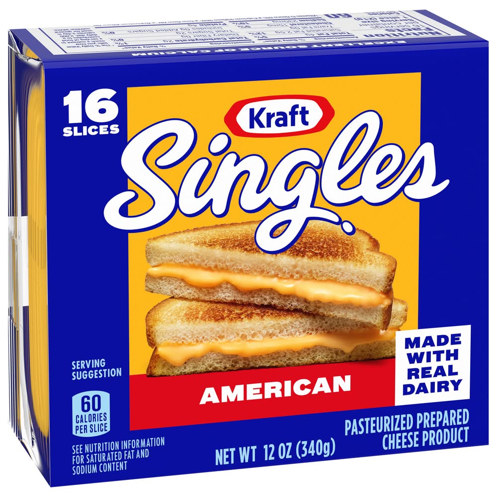 Delicious any way you square it, Kraft Singles American Cheese Slices deliver the classic American taste and irresistible melt that take your favorite foods to the next level. Made with real dairy and no artificial flavors or preservatives, our sliced cheese has a mild, savory flavor and smooth, creamy texture that’s perfectly melty. Our simple squares are ideal for more than just grilled cheese. Try adding Kraft Singles to your breakfast sandwich, burger or tuna melt. Transform steak and bread into a Philly cheesesteak, put a twist on ramen or turn plain fries into ooey gooey cheese fries. When you’re craving classic comfort food, add America's favorite square to your mac and cheese for a simple joy that’s sure to make you smile. Each cheese slice comes individually wrapped for convenience, so you can stack and snack any time. Kraft Singles contain 50 calories and 3 grams of protein per serving. For optimal creamy goodness, keep our pack of 16 cheese slices refrigerated • Brand: Kraft • Kraft Heinz Foods Company, Chicago,IL,60601