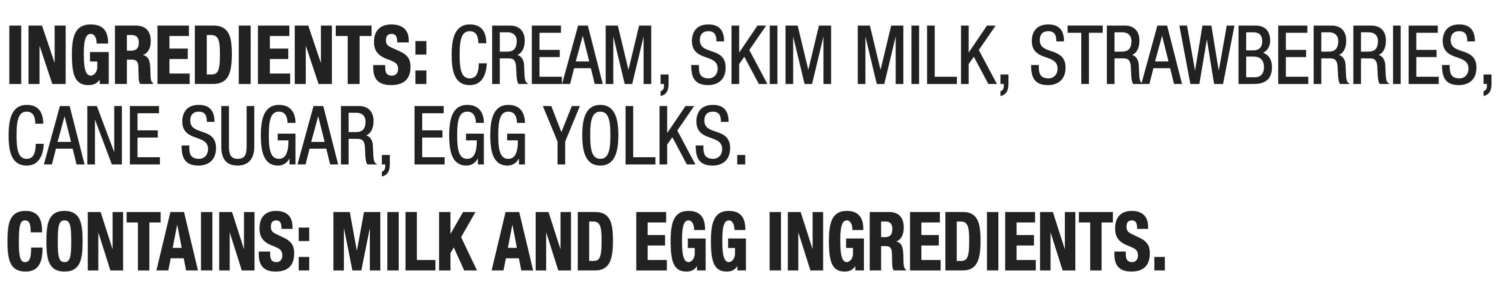 Ingredients: Cream, Skim Milk, Strawberries, Cane Sugar, Egg Yolks Contains: Milk, Eggs