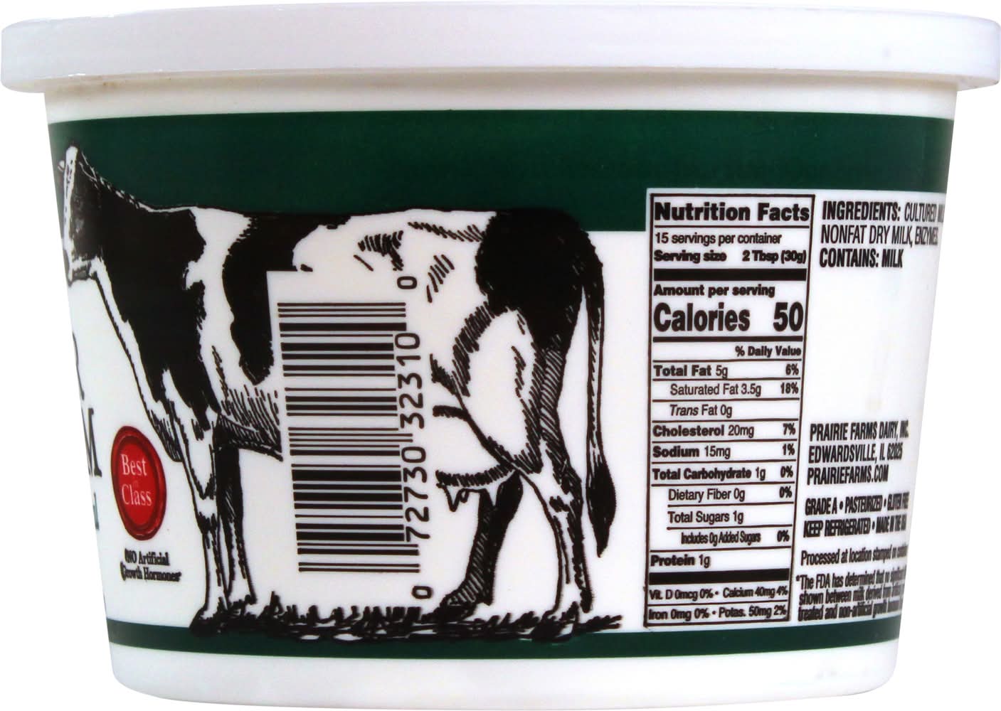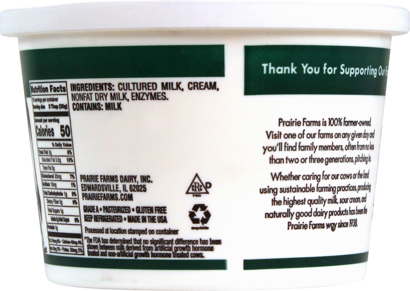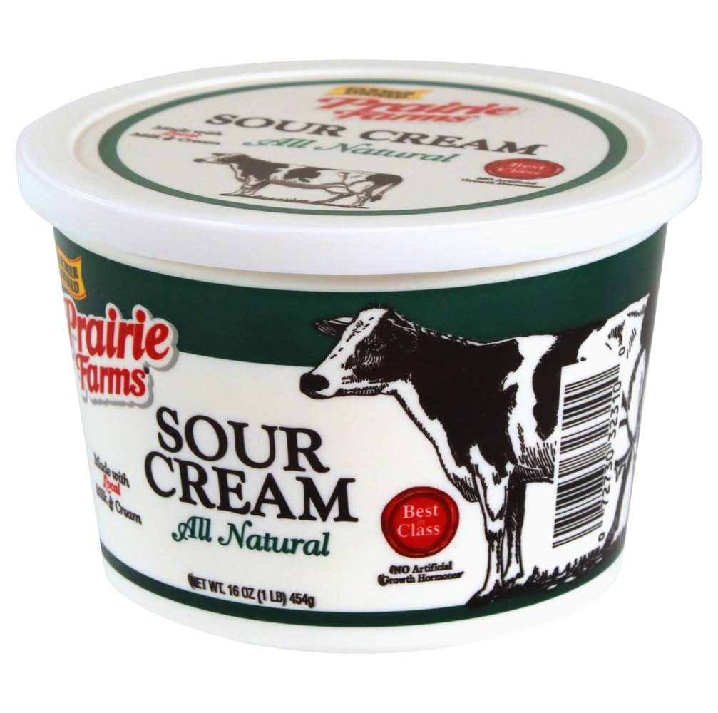 All Natural Sour Cream offers a rich, creamy taste and texture. Ideal for enhancing the flavor of your favorite recipes or as a standalone topping, this sour cream is crafted without artificial additives. • Brand: Prairie farms • gluten-free, kosher • Packaging: Reusable