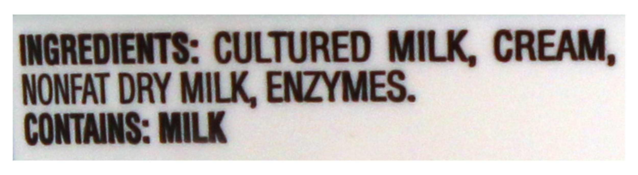 Ingredients: Grade A Cultured Milk and Cream, Enzymes Contains: Milk