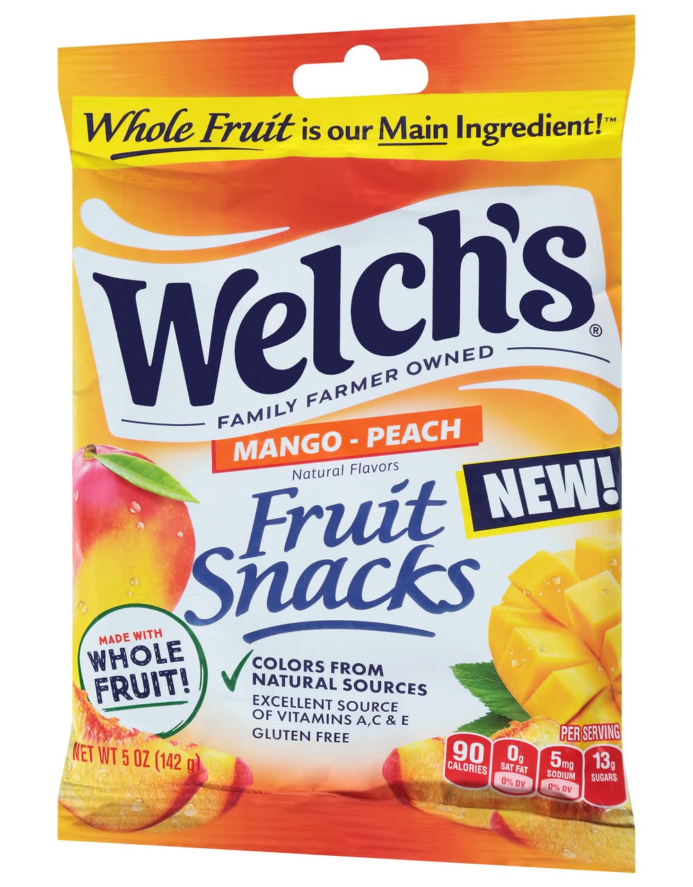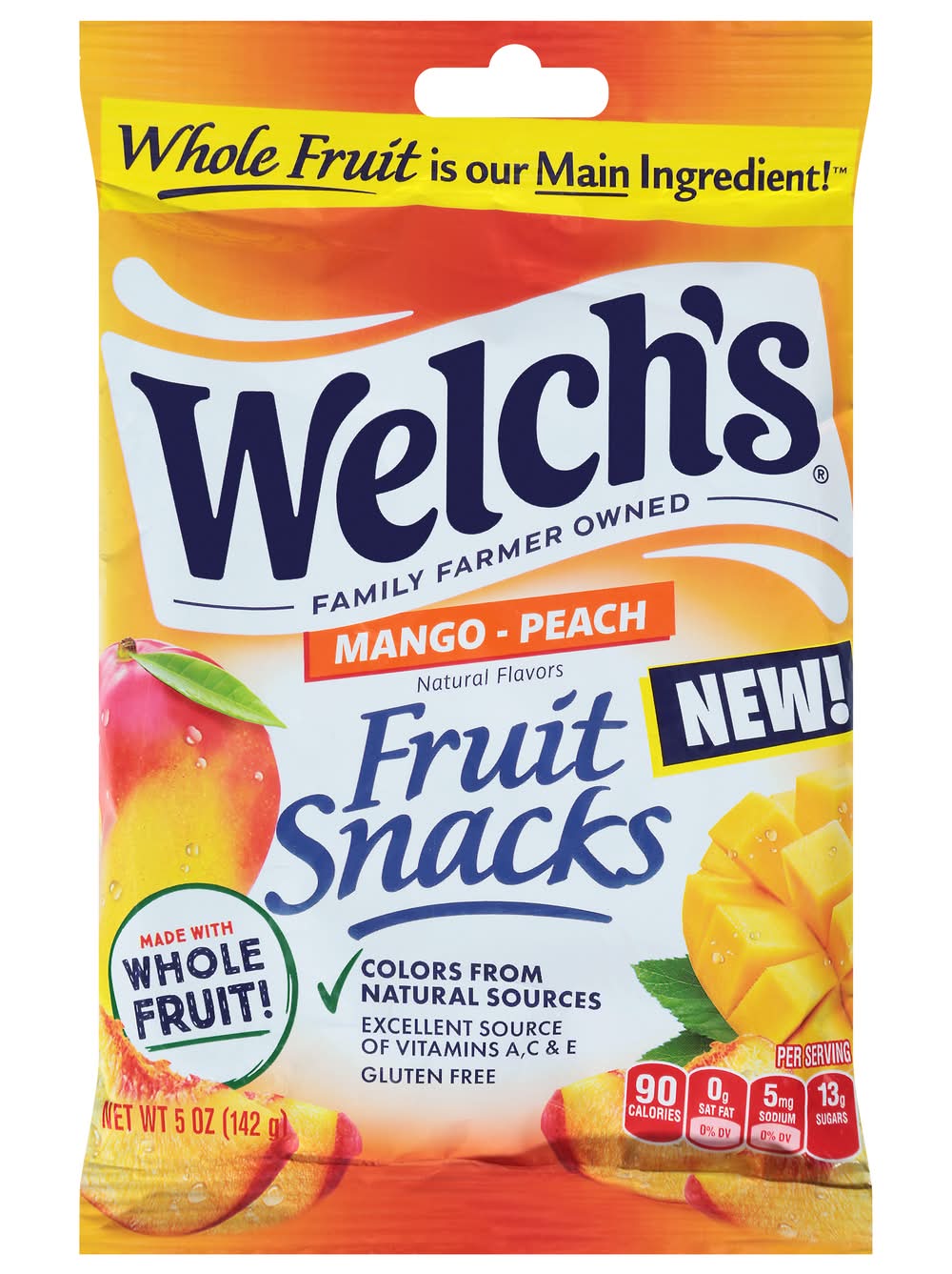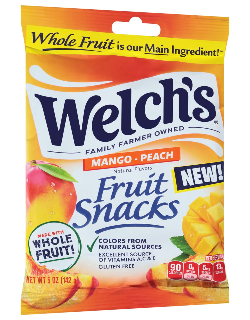 Welch’s Fruit Snacks Mango-Peach 5oz bag delivers a bold fruit flavor fusion in every bite. These snack packs combine delicious mango and peach flavors, Made with Whole Fruit and Colors from Natural Sources. • Brand: Welch's • Flavor: Mango-peach • gluten-free