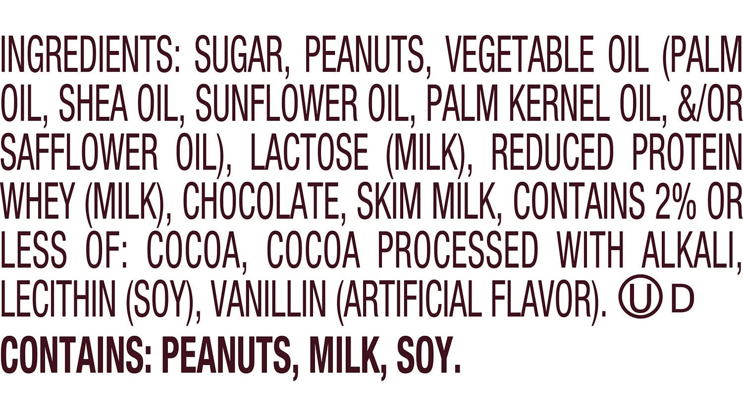 Ingredients: SUGAR, PEANUTS, VEGETABLE OIL (PALM OIL, SHEA OIL, SUNFLOWER OIL, PALM KERNEL OIL, /OR SAFFLOWER OIL), LACTOSE (MILK), REDUCED PROTEIN WHEY (MILK), CHOCOLATE, SKIM MILK, CONTAINS 2% OR LESS OF: COCOA, COCOA PROCESSED WITH ALKALI, LECITHIN (SOY), VANILLIN (ARTIFICIAL FLAVOR), . Contains: Contains: Peanuts|Soy|Milk