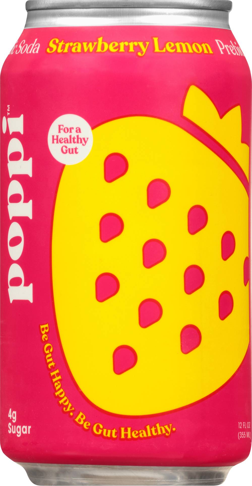 For a healthy gut. Be gut happy. Be gut healthy. Pop, cultured. Facts - No one wants a basic drink. So make every hour happy with this bubbly, better for you prebiotic soda that keeps your gut happy and gives your bod a boost. Downright delicious with 5 g sugar or less, these bubbles with benefits will be your new BFF. Prebiotics for a healthy gut. Infused with apple cider vinegar. Immunity sidekick. • Brand: Poppi • Flavor: Strawberry-lemon • Poppi, Dallas, TX • Packaging: Reusable