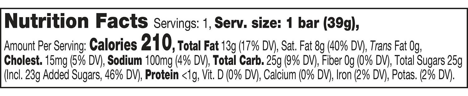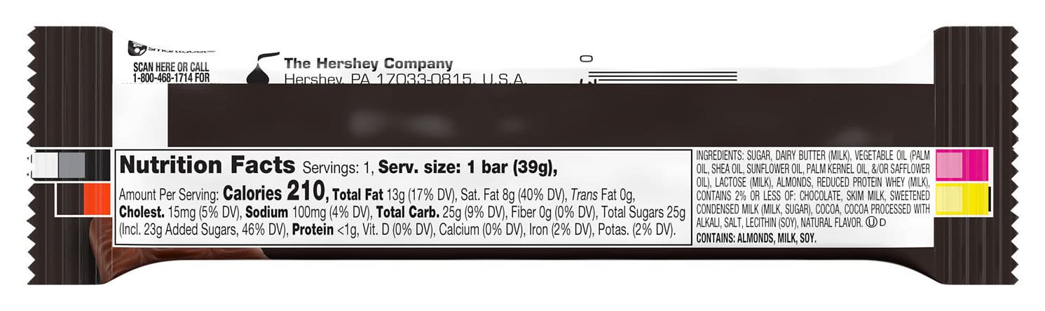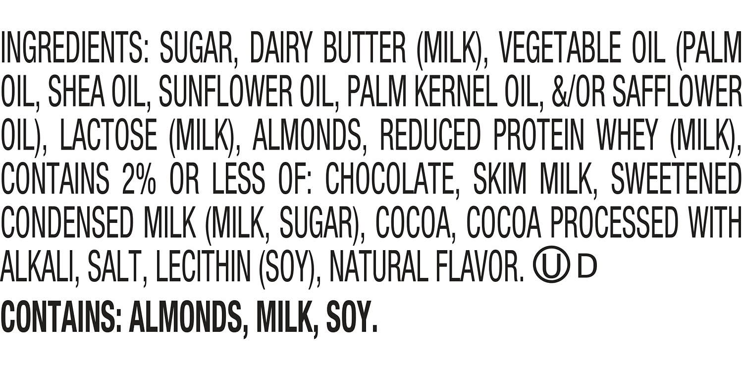 Ingredients: SUGAR, DAIRY BUTTER (MILK), VEGETABLE OIL (PALM OIL, SHEA OIL, SUNFLOWER OIL, PALM KERNEL OIL, /OR SAFFLOWER OIL), LACTOSE (MILK), ALMONDS, REDUCED PROTEIN WHEY (MILK), CONTAINS 2% OR LESS OF: CHOCOLATE, SKIM MILK, SWEETENED CONDENSED MILK (MILK, SUGAR), COCOA, COCOA PROCESSED WITH ALKALI, SALT, LECITHIN (SOY), NATURAL FLAVOR. Contains: Milk, Soybeans, Lactose