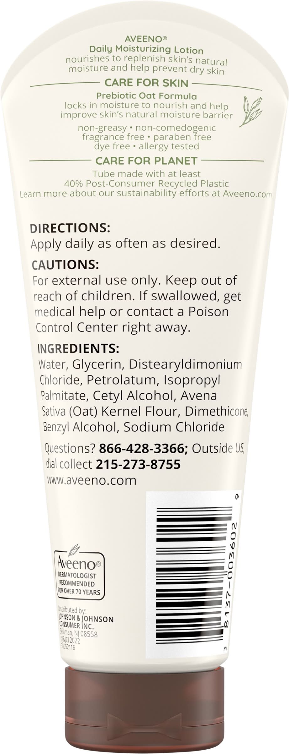 New look. Same great formula. Dimethicone skin protectant. Nourishes dry skin. Clinically proven healthier-looking skin in 1 day. Fragrance free. Aveeno Daily Moisturizing Lotion Fragrance-Free is a clinically proven, award-winning lotion that locks-in moisture to help prevent, protect and nourish dry skin. This unique oatmeal formula absorbs quickly, leaving your skin soft, beautiful and healthy-looking. With soothing oat. With rich emollients. 24 Hour moisture. Aveeno - Dermatologist recommended for over 65 years. • Brand: Aveeno • Johnson & Johnson Consumer, Skillman, NJ, 08558
