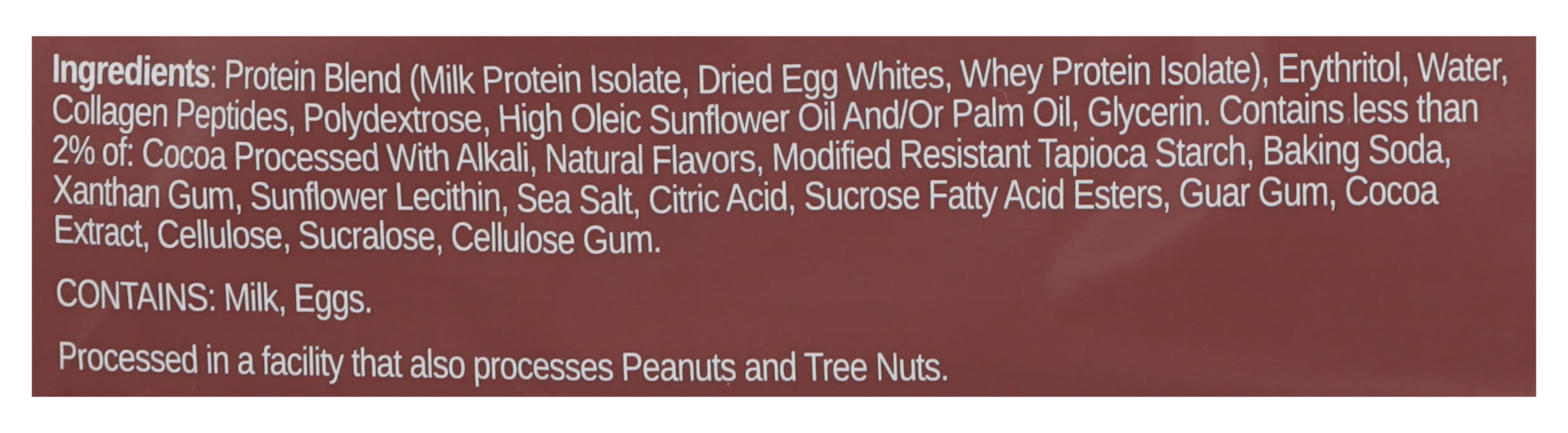 Ingredients: Protein Blend (Milk Protein Isolate, Dried Egg Whites, Whey Protein Isolate), Erythritol, Water, Collagen Peptides, Polydextrose, High Oleic Sunflower Oil and/or Palm Oil, Glycerin, Contains Less than 2% of: Cocoa Processed with Alkali, Natural Flavors, Modified Resistant Tapioca Starch, Baking Soda, Xanthan Gum, Sunflower Lecithin, Sea Salt, Citric Acid, Sucrose Fatty Acid Esters, Guar Gum, Cocoa Extract, Cellulose, Sucralose, Cellulose Gum Contains: Milk, Eggs, Peanuts, Tree Nuts