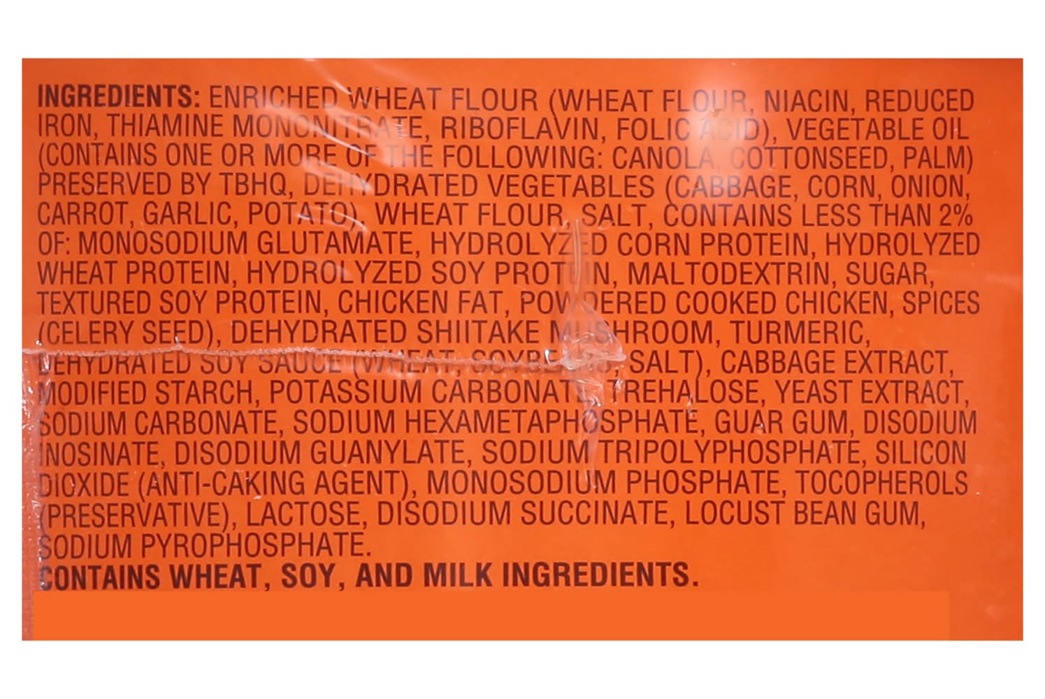 Ingredients: Enriched Wheat Flour (Wheat Flour, Niacin, Reduced Iron, Thiamine Mononitrate, Riboflavin, Folic Acid), Vegetable Oil (Contains One or More of the Following: Canola, Cottonseed, Palm) Preserved by TBHQ, Dehydrated Vegetables (Cabbage, Corn, Onion, Carrot, Garlic, Potato), Wheat Flour, Salt, Contains Less than 2% of: Monosodium Glutamate, Hydrolyzed Corn Protein, Hydrolyzed Wheat Protein, Hydrolyzed Soy Protein, Maltodextrin, Sugar, Textured Soy Protein, Chicken Fat, Powdered Cooked Chicken, Spices (Celery Seed), Dehydrated Shiitake Mushroom, Turmeric, Dehydrated Soy Sauce (Wheat, Soybeans, Salt), Cabbage Extract, Modified Starch, Potassium Carbonate, Trehalose, Yeast Extract, Sodium Carbonate, Sodium Hexametaphosphate, Guar Gum, Disodium Inosinate, Disodium Guanylate, Sodium Tripolyphosphate, Silicon Dioxide (Anti-Caking Agent), Monosodium Phosphate, Tocopherols (Preservative), Lactose, Disodium Succinate, Locust Bean Gum, Sodium Pyrophosphate. Contains: Wheat, Soybeans, Corn, Celery, Lactose, Crustacean Shellfish, Sesame