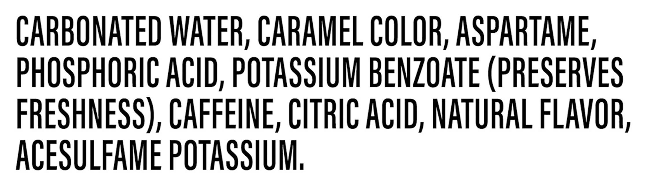 Ingredients: Carbonated Water, Caramel Color, Aspartame, Phosphoric Acid, Potassium Benzoate (Preserves Freshness), Caffeine, Citric Acid, Natural Flavor, Acesulfame Potassium Contains: Phenylalanine