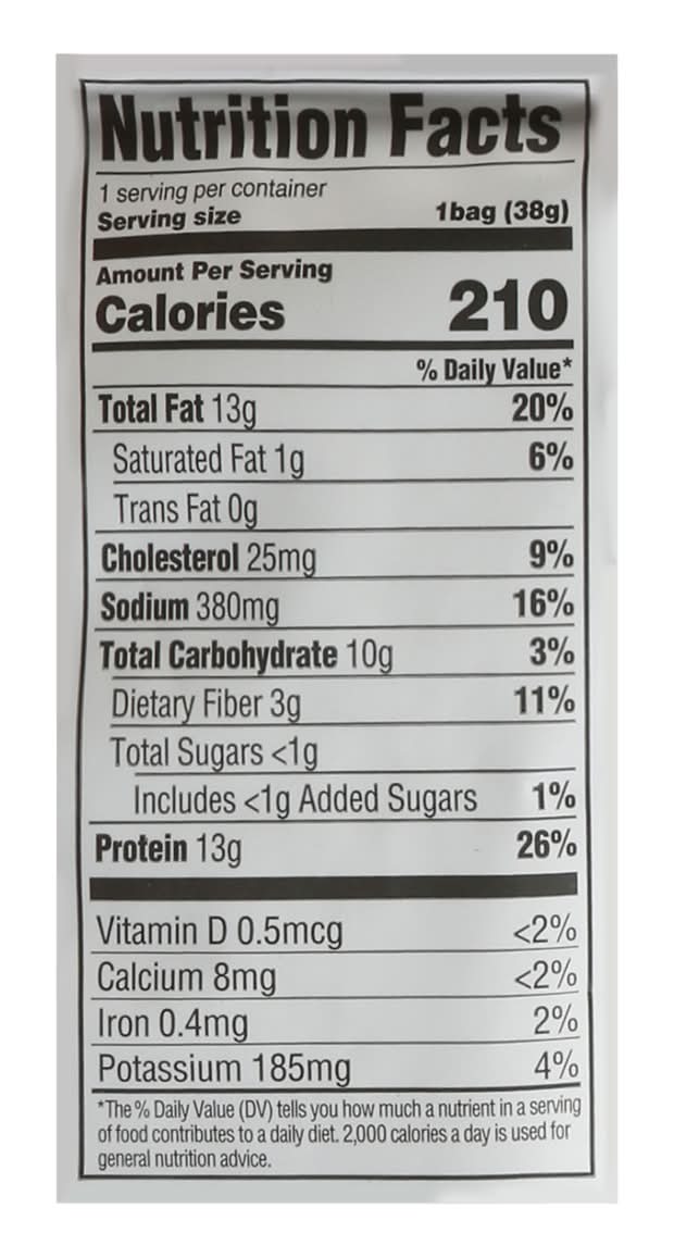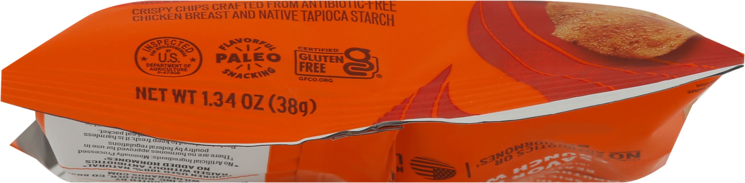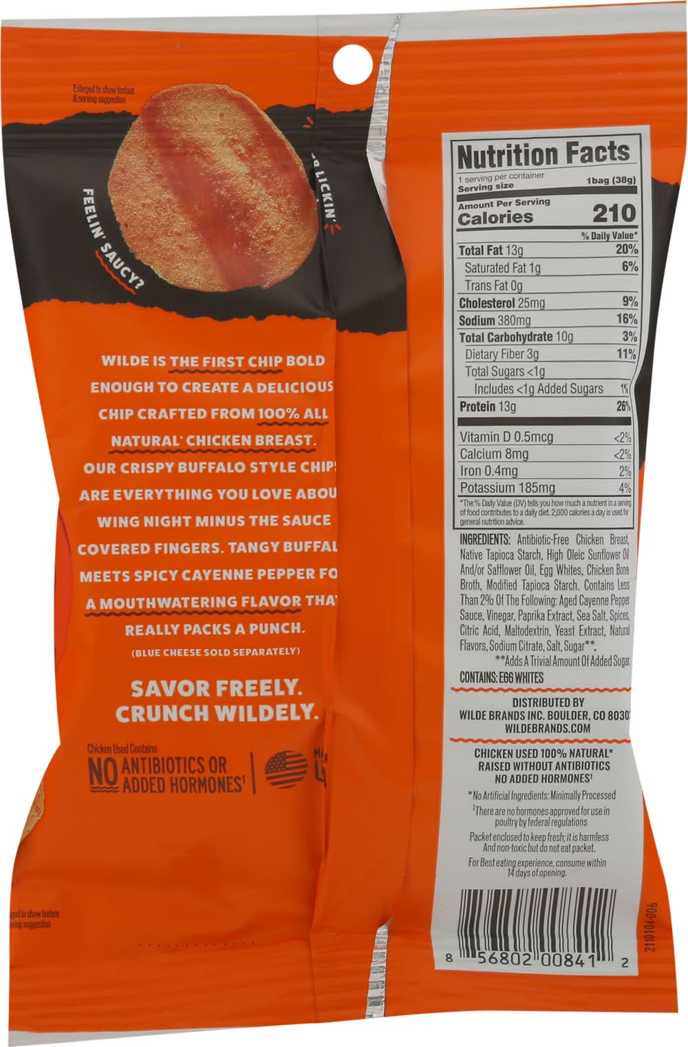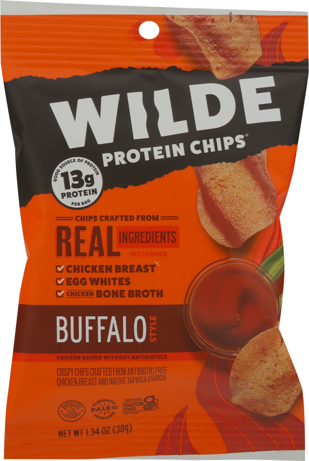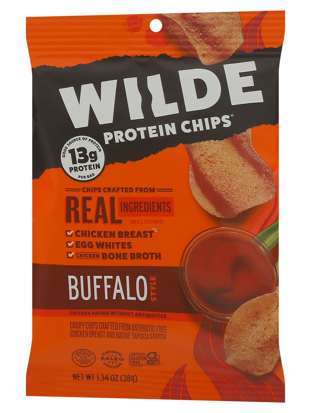 Chips crafted from real ingredients. 13 g protein per bag. Good source of protein. Paleo: Flavorful snacking. Vegetarian fed. Egg whites. Chicken raised without antibiotics. Crispy chips crafted from antibiotic-free chicken breast and native tapioca starch. Wilde is the first chip bold enough to create delicious chip crafted from 100% all natural (No artificial ingredients; minimally processed) . Our chips are everything you love about wing night minus the sauce covered fingers. • Brand: Wilde • Flavor: Buffalo style chicken • gluten-free • Wilde Brands Inc., Boulder,CO,80302