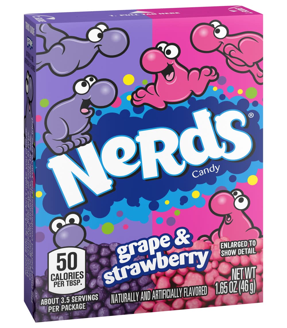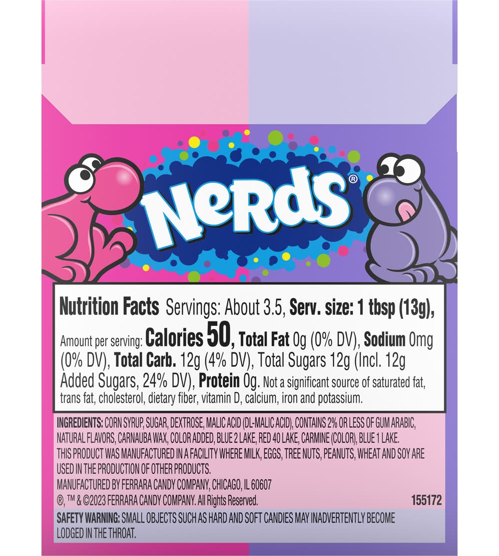 Nerds Grape and Strawberry Crunchy Candy offer a blend of naturally and artificially flavored grape and strawberry taste. Each tablespoon portion contains 50 calories, with approximately 3.5 servings in each package. The candy provides a texturally satisfying crunch in a dual-flavored experience, pairing grape and strawberry flavors. • Brand: Nerds • Number of servings: 3