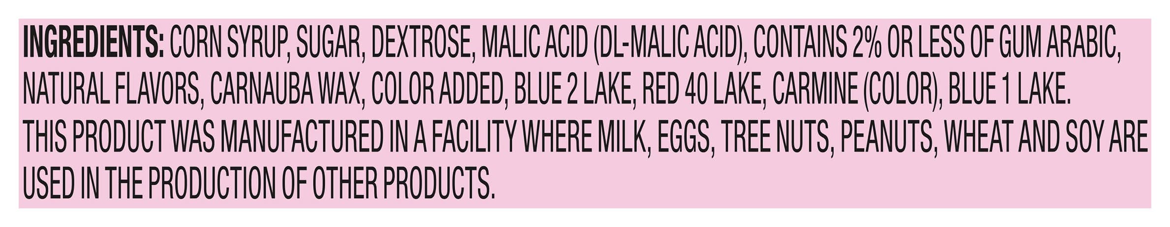 Ingredients: DEXTROSE, SUGAR, MALIC ACID, 2% OR LESS OF CORN SYRUP, NATURAL FLAVORS, CARNAUBA WAX, CARMINE COLOR, COLOR ADDED, BLUE 1 LAKE, BLUE 2 LAKE, RED 40 LAKE. Contains: Eggs