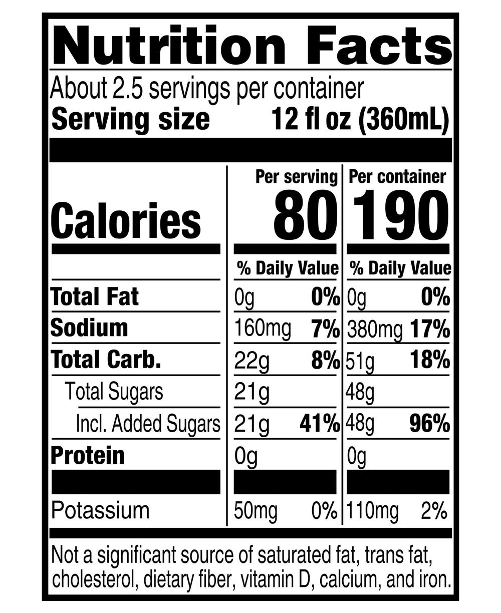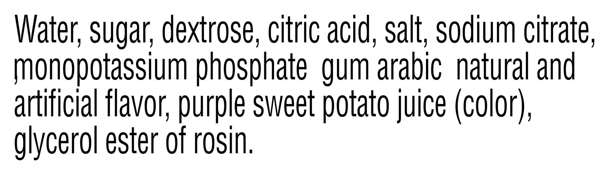 Ingredients: Water, Sugar, Dextrose, Citric Acid, Salt, Sodium Citrate, Monopotassium Phosphate, Gum Arabic, Natural and Artificial Flavor, Purple Sweet Potato Juice (Color), Glycerol Ester of Rosin